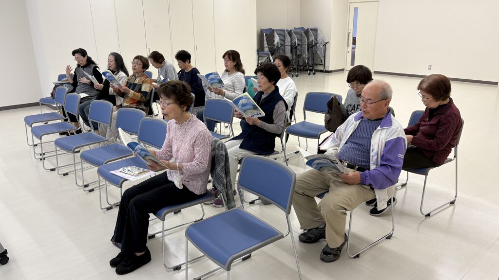 春の名曲を中心に「♪ちゅーりっぷ」では声を揃える練習を行いました。お隣の方の綺麗な声を意識すると、アラ不思議!まとまりのある素敵な歌声に変わっていきます。