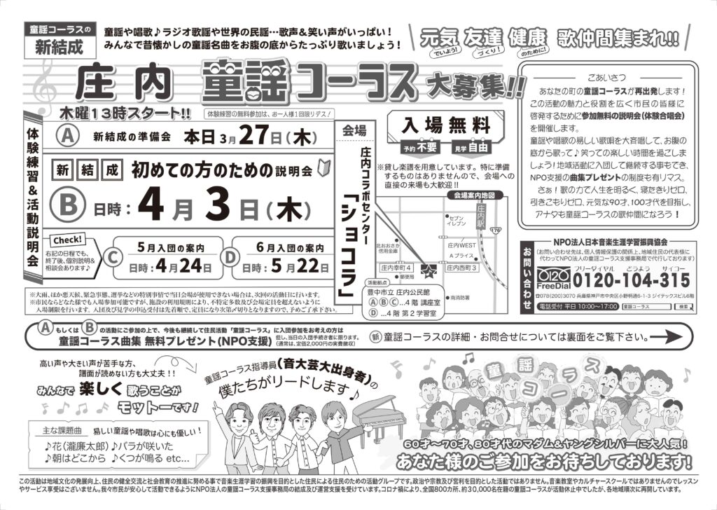 2023年2月に新しく豊中市内庄内地区でオープンした、庄内コラボセンター「ショコラ」にて童謡コーラスが新たにスタート!本日はその活動の様子をレポートします!