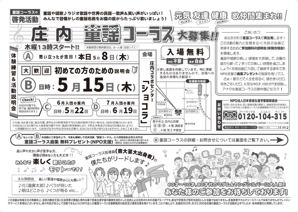 また、毎週日曜日の朝10:00からはサンテレビにて社会教育番組「童謡コーラス名曲大合唱&みんなの音楽会テレビ」も放映中です。お茶の間でも是非歌いましょうね♪
