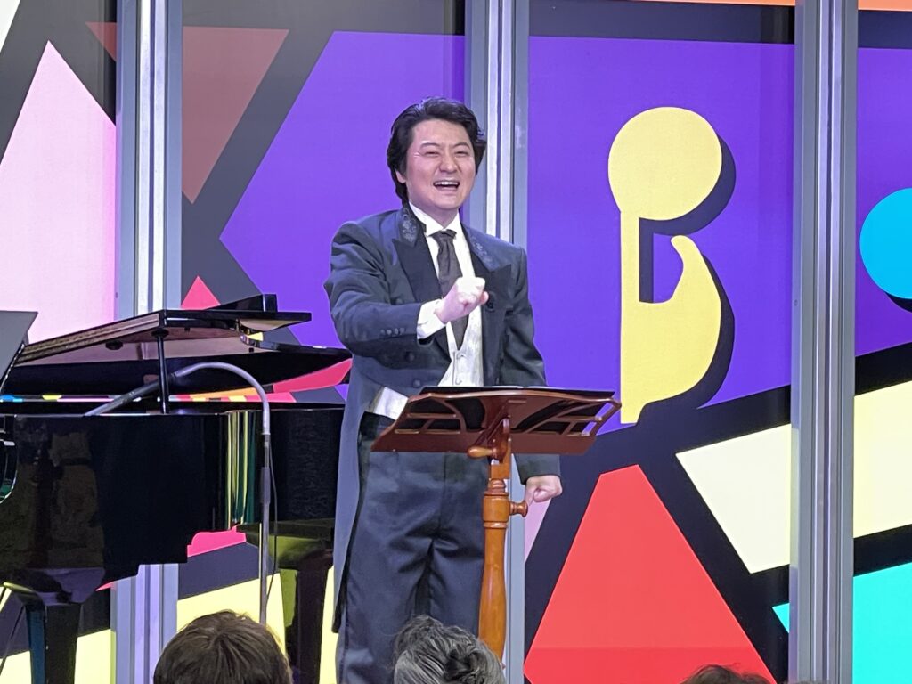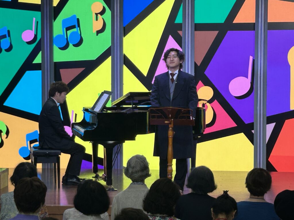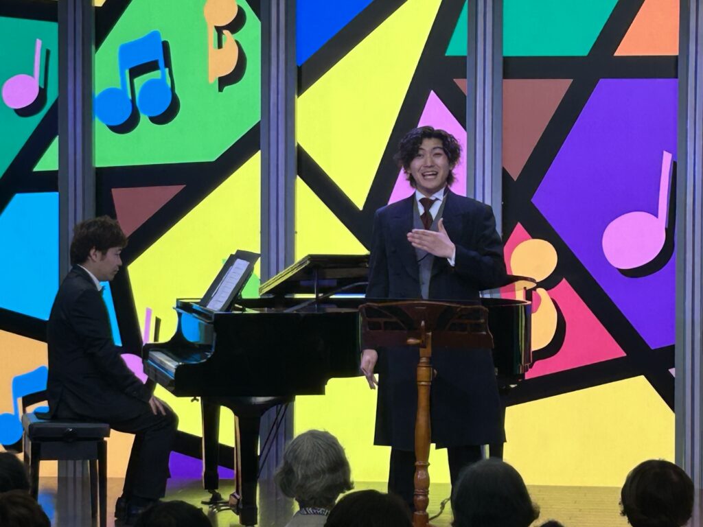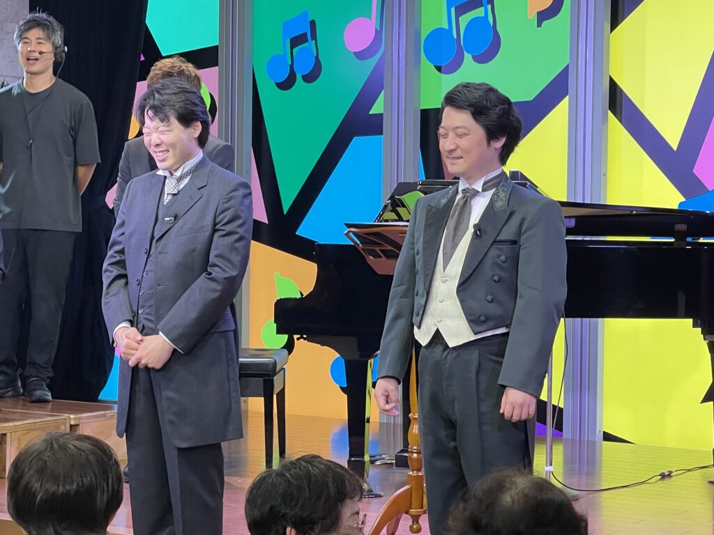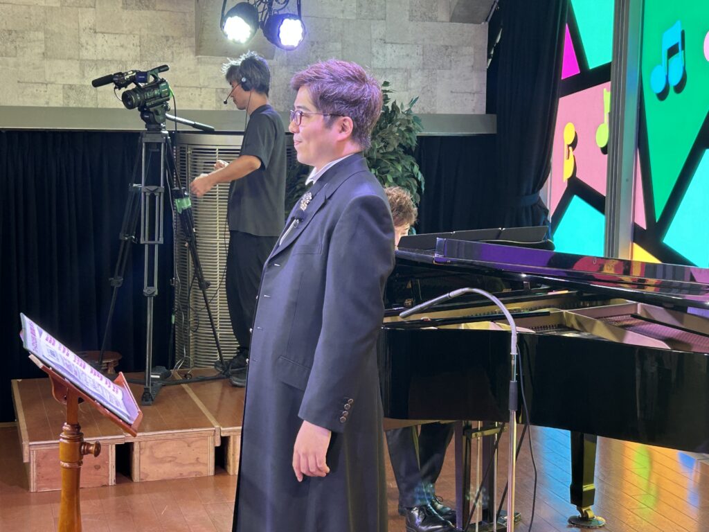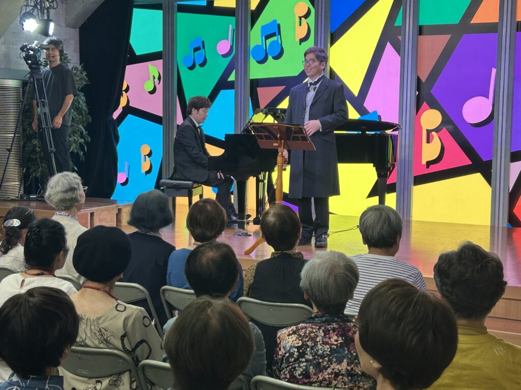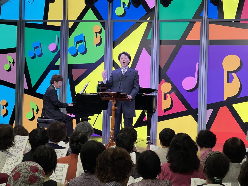 会場が温まったところで、収録がはじまります。 「続きましてのコーナーは、みんなで歌おう♪童謡コーラス名曲大合唱のコーナーです。担当しますのは……」杵渕亮指導員と上田祐大指導員です。ピアニストは、保坂佑亮指導員です。