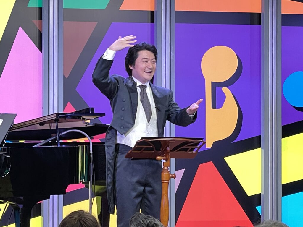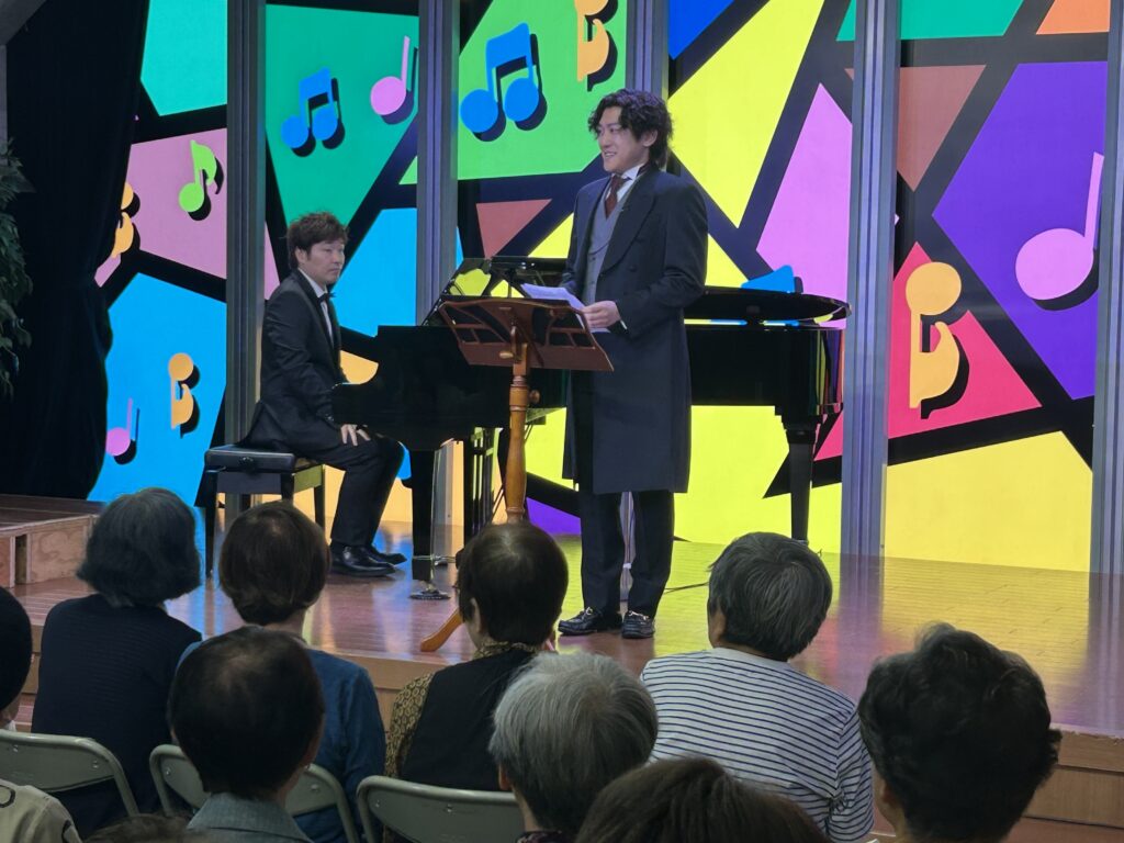 「続きましてのコーナーは、みんなで歌おう♪童謡コーラス名曲大合唱のコーナーです。担当しますのは……」山崎亮指導員と鈴木アトム指導員です。ピアニストは、午前の部に引き続き保坂佑亮指導員です。