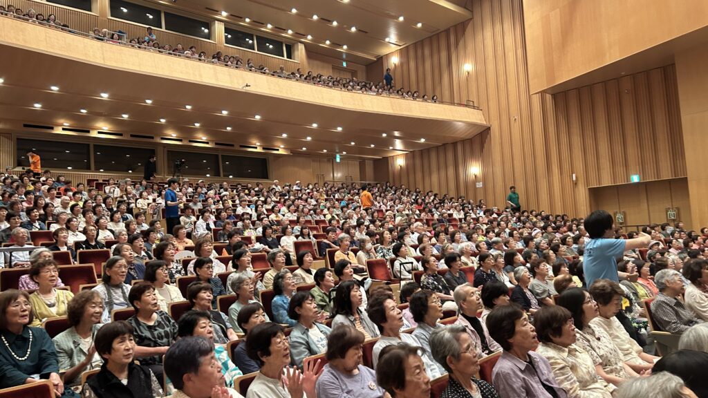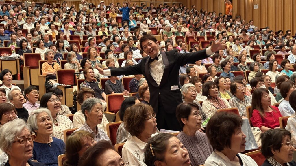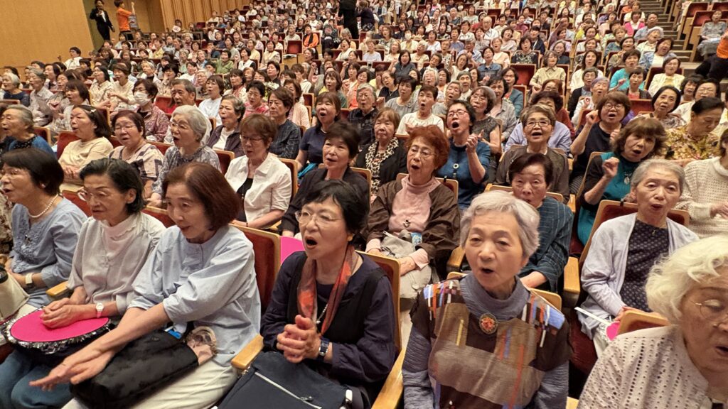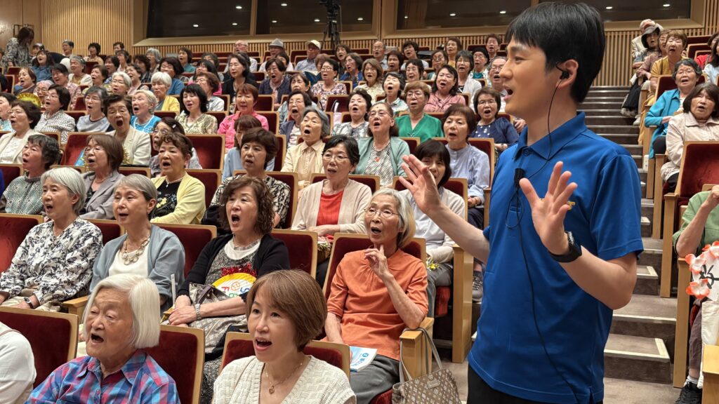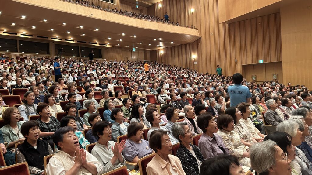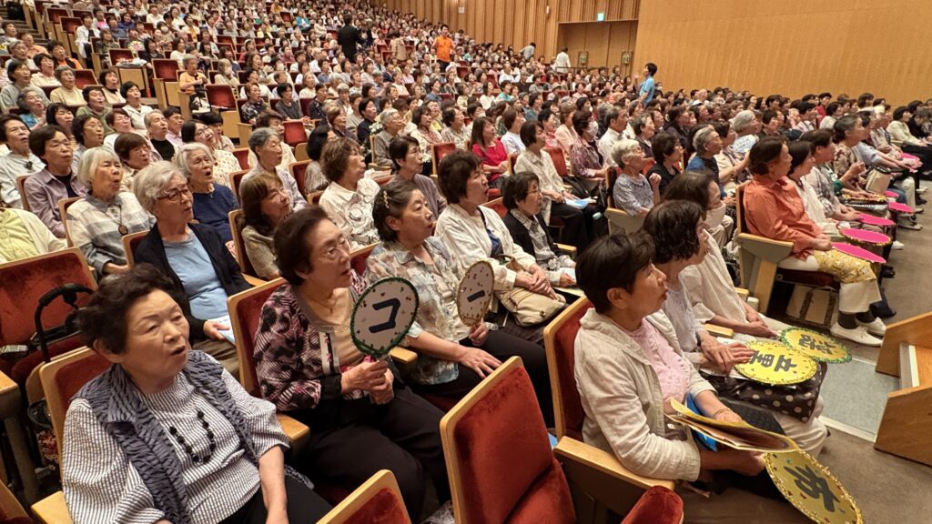 童謡コーラス2025年上半期の活躍と功績を讃え、若く明るい歌声で大合唱! 会場客席が童謡コーラス大合唱のステージ! さぁ!指揮者のタクトに合わせて1、2、3、ハイッ!