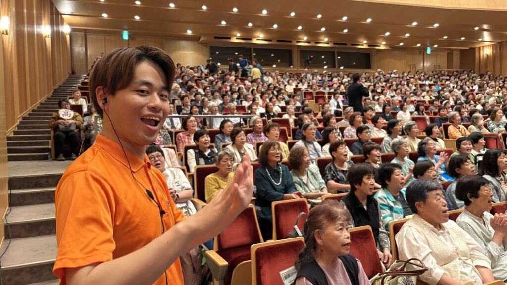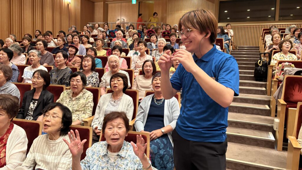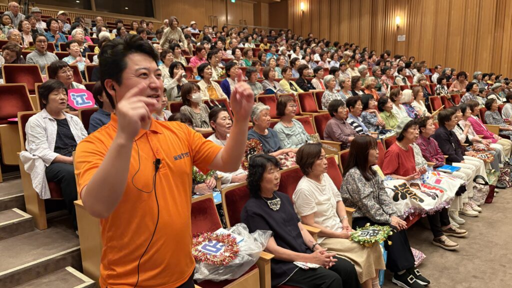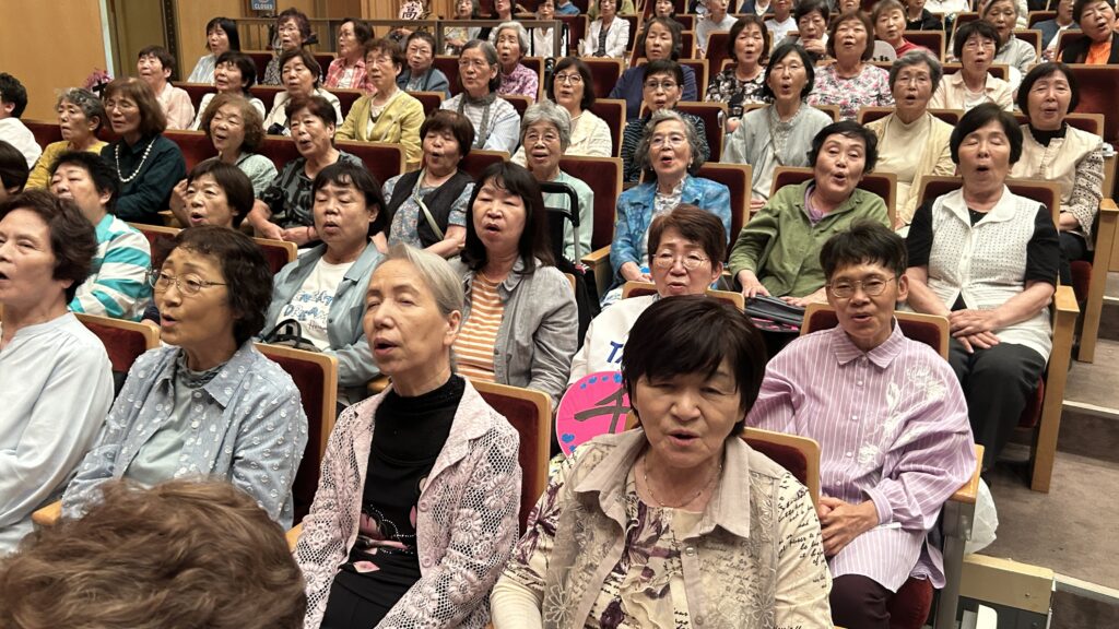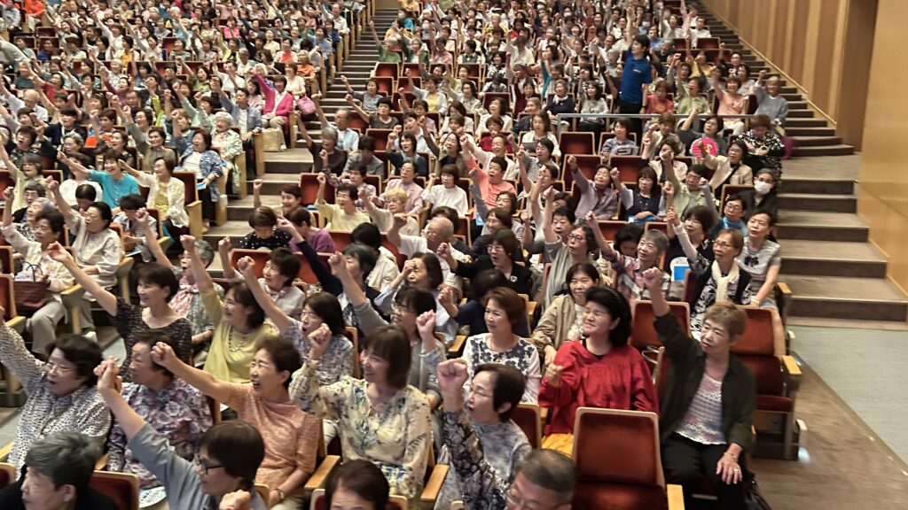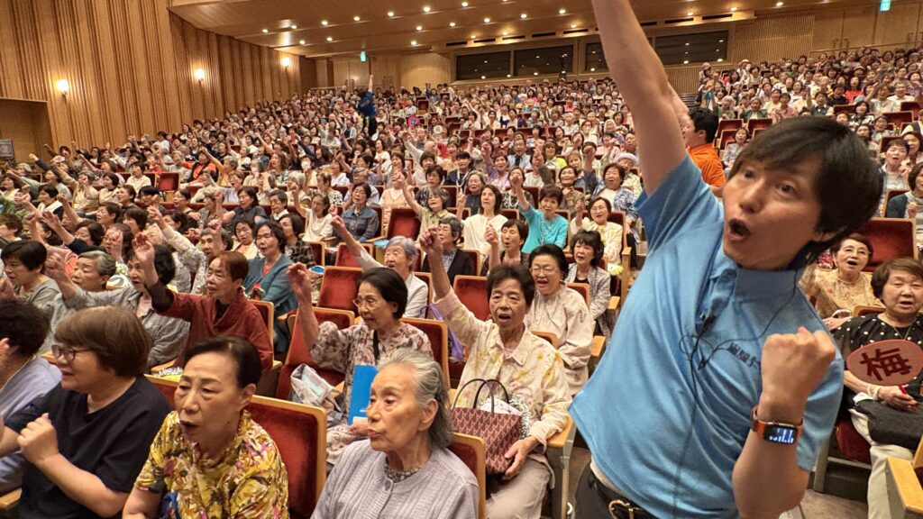 童謡コーラス2025年上半期の活躍と功績を讃え、若く明るい歌声で大合唱! 会場客席が童謡コーラス大合唱のステージ! さぁ!指揮者のタクトに合わせて1、2、3、ハイッ!