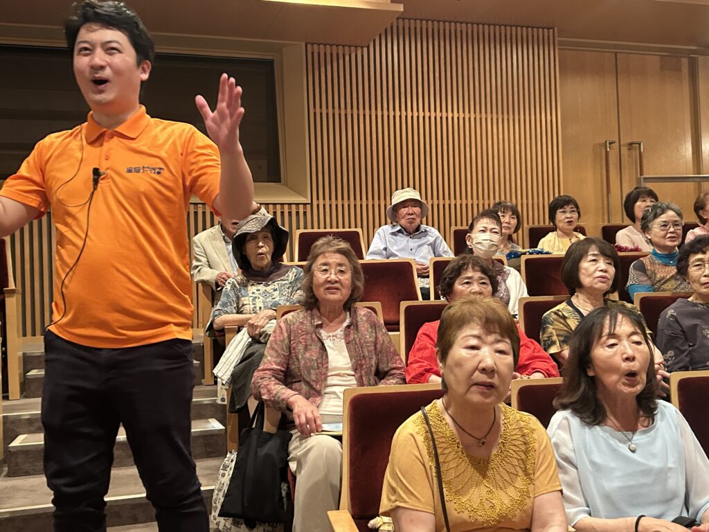 ↑第1部「テレビ発表会」の舞台発表を終えても参加者の皆様にはまだまだ、若きパワーが有り余っていますね、大好きな童謡や唱歌の名曲メドレーを歌いあげます🎶