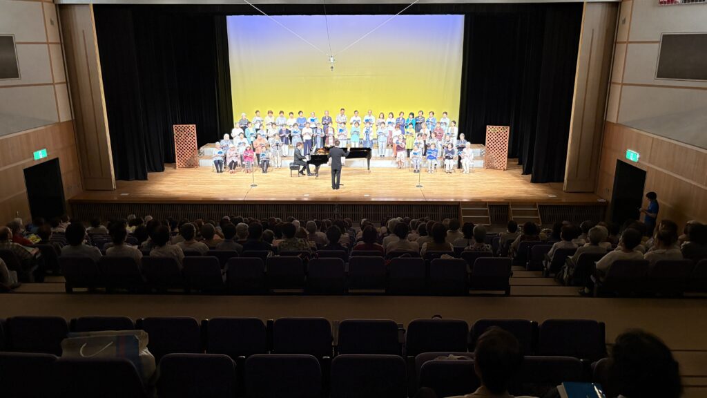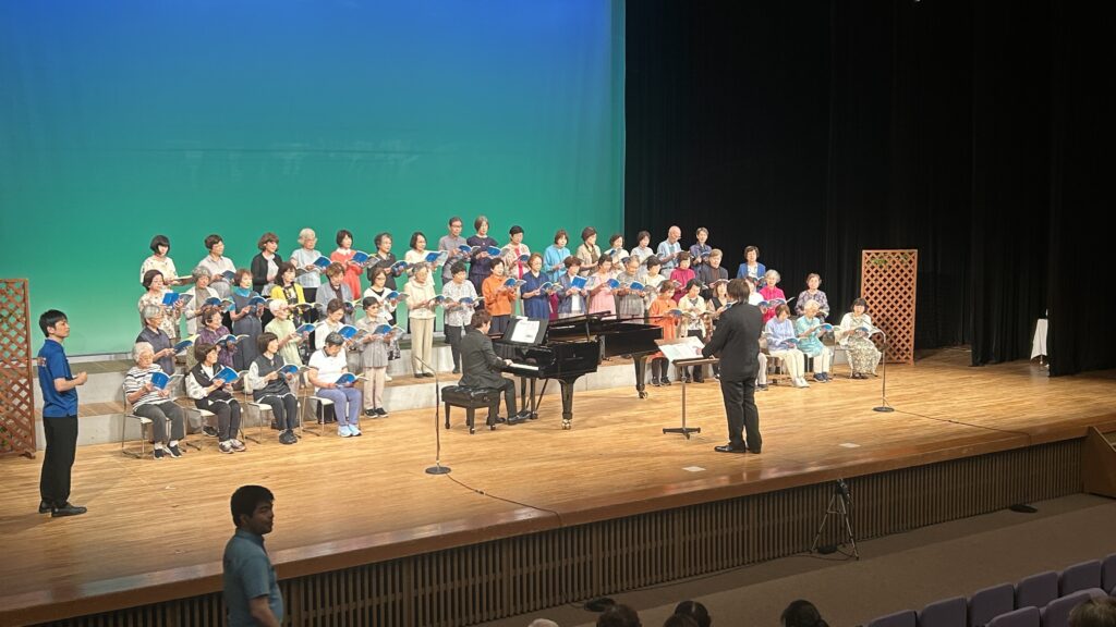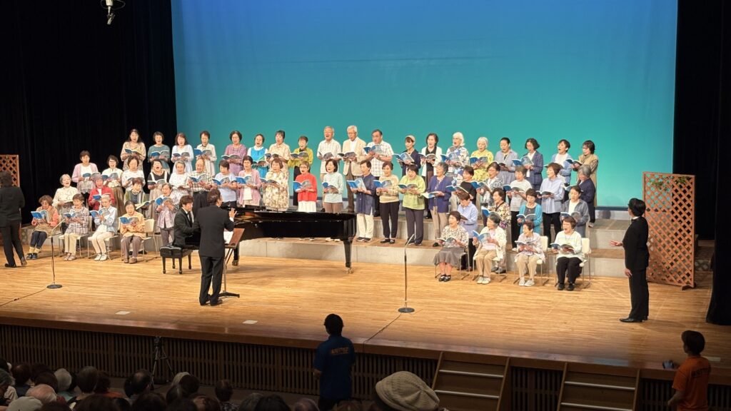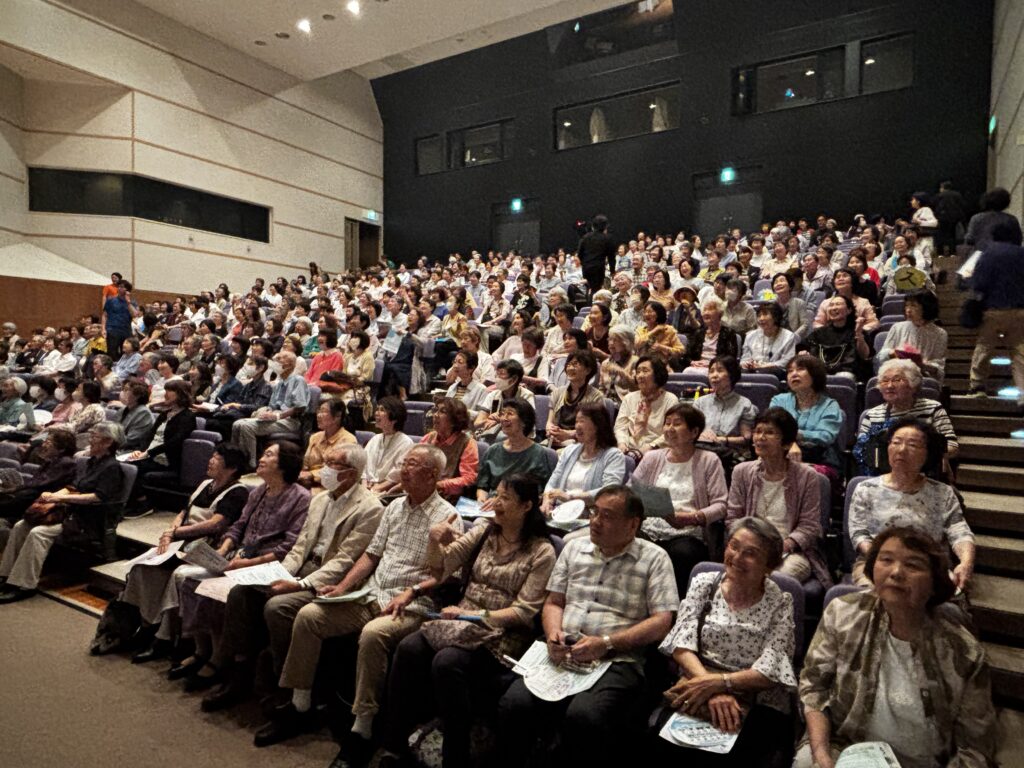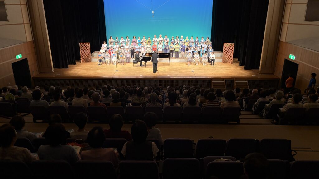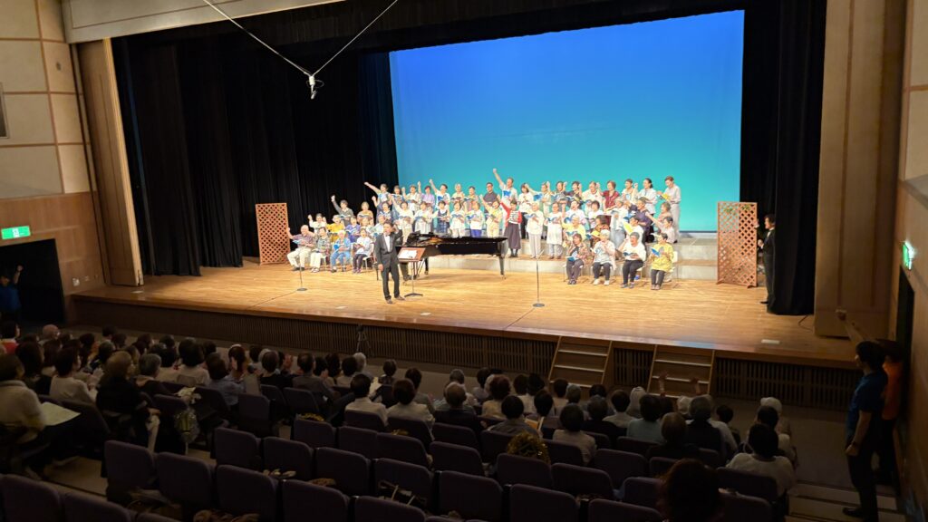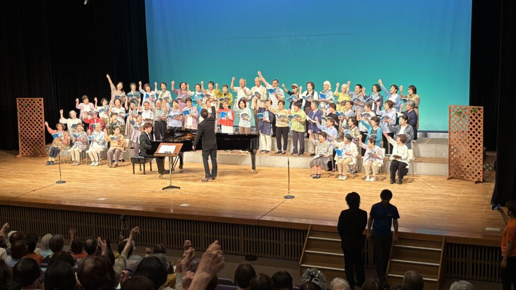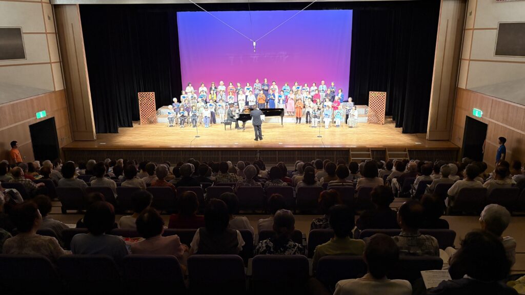 本日はお暑い中、梅雨空で足元の悪い中、童謡コーラス夏季定期公演「2025年夏の大合唱会」京都公演にご来場を賜り誠にありがとうございました。また、各地区童謡コーラスの出演参加者の皆様におかれましては、日頃の練習の成果を見事に発揮して、舞台発表のテレビ番組の収録大成功、お疲れ様でした。