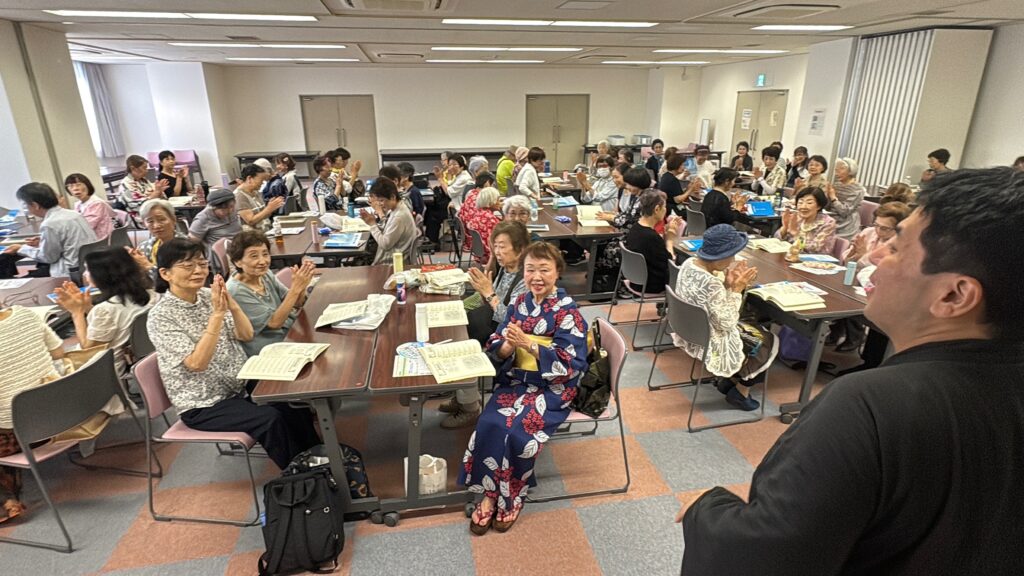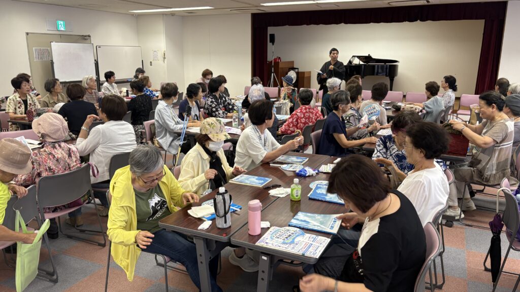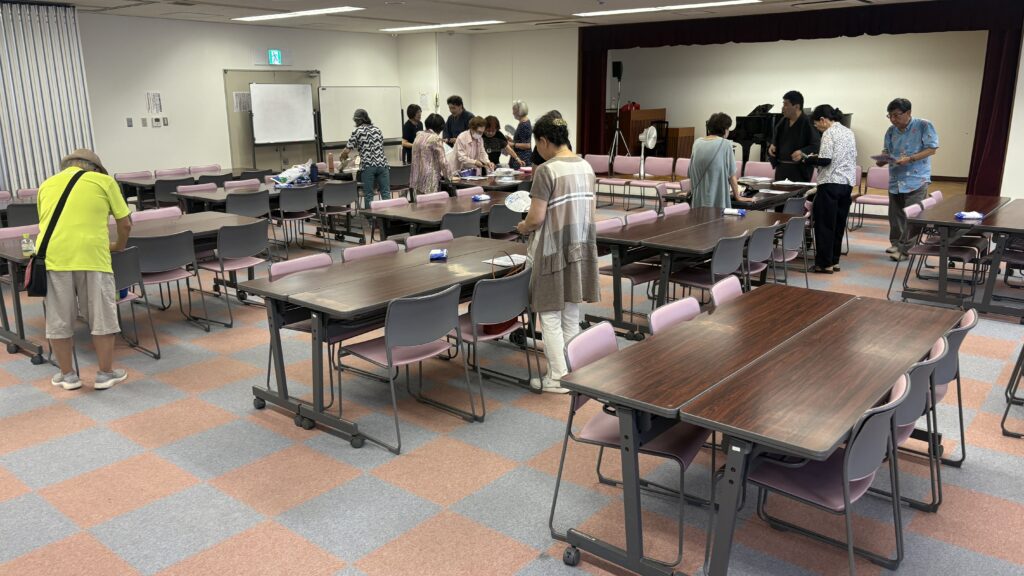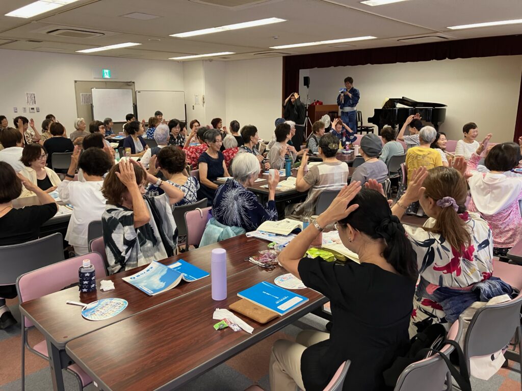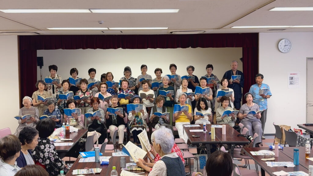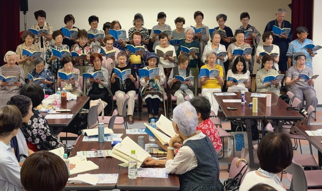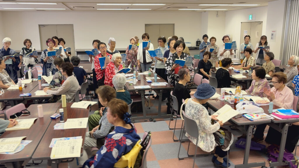 2025年7月23日(水)午後2時00分〜3時30分、ノバティホールのノバティ長野南館3階多目的ホールにおいて、童謡コーラスの2025年納涼会「河内長野祭」が行われました。この会場は、河内長野童謡コーラスの活動拠点でもあり、月曜日の朝10時00分から月2〜3回のペースで活動しています。本日は、近隣の姉妹コーラスからも参加され大人数での合唱会が実現しました。