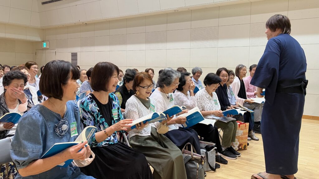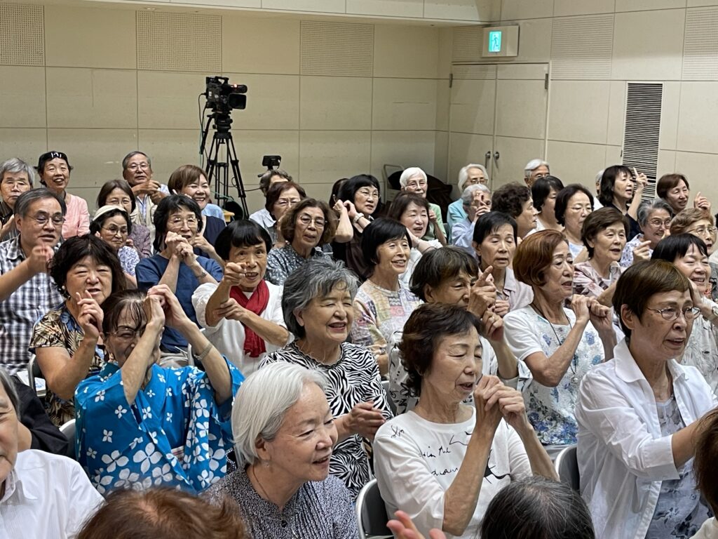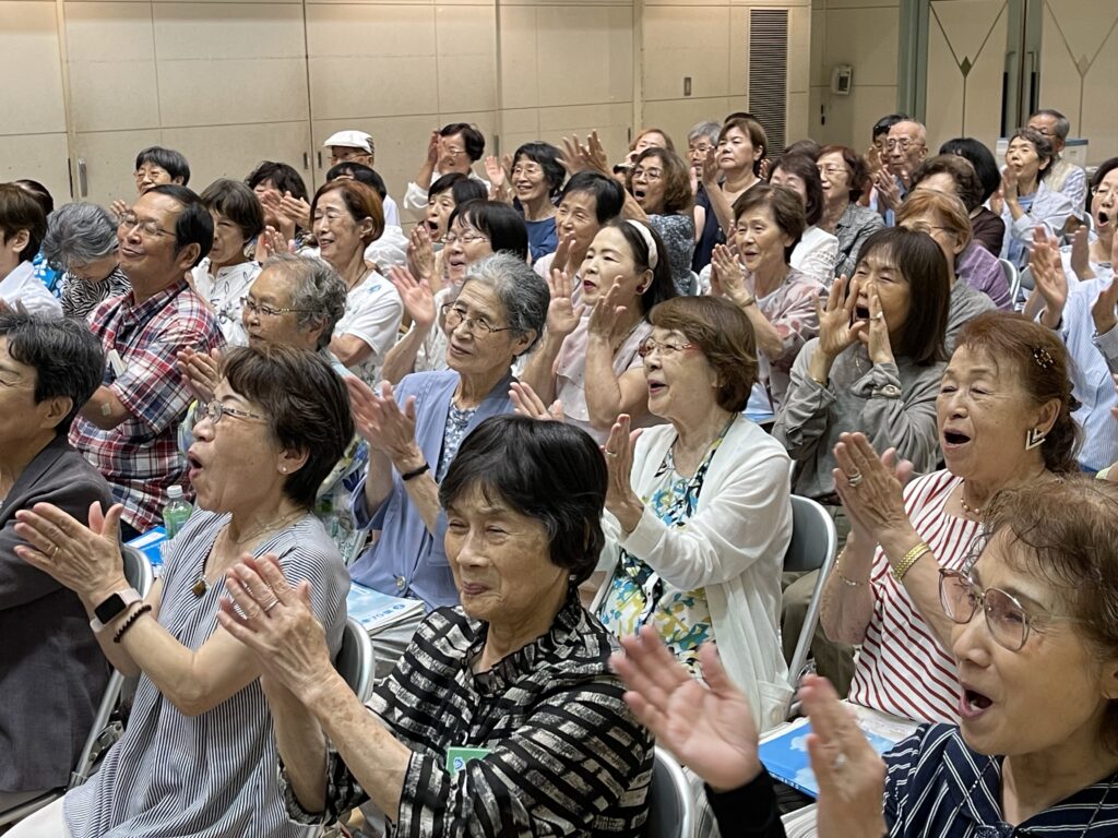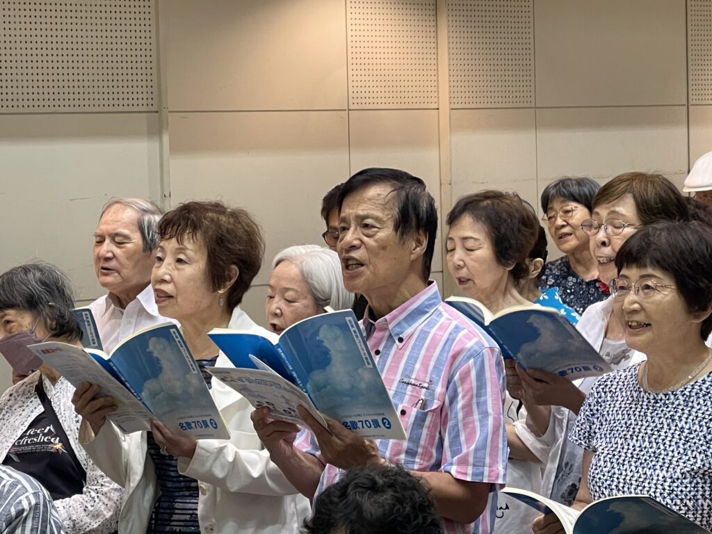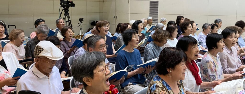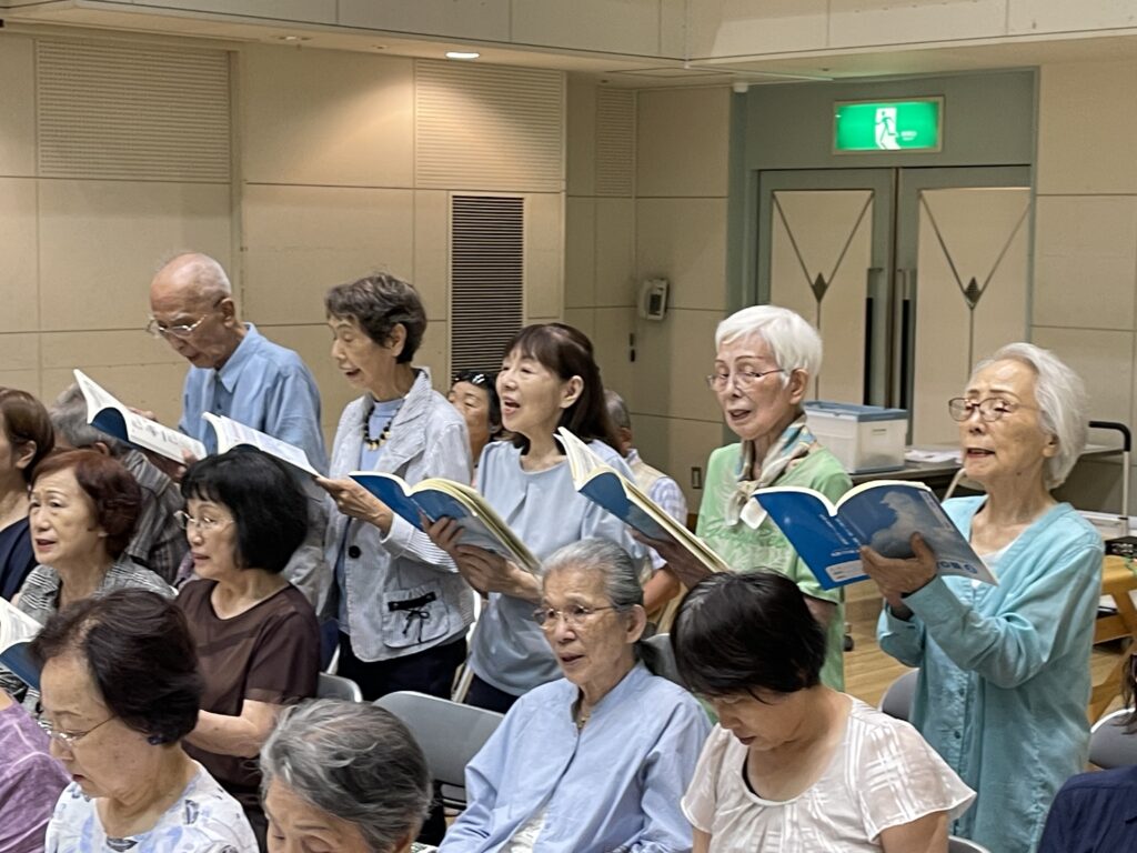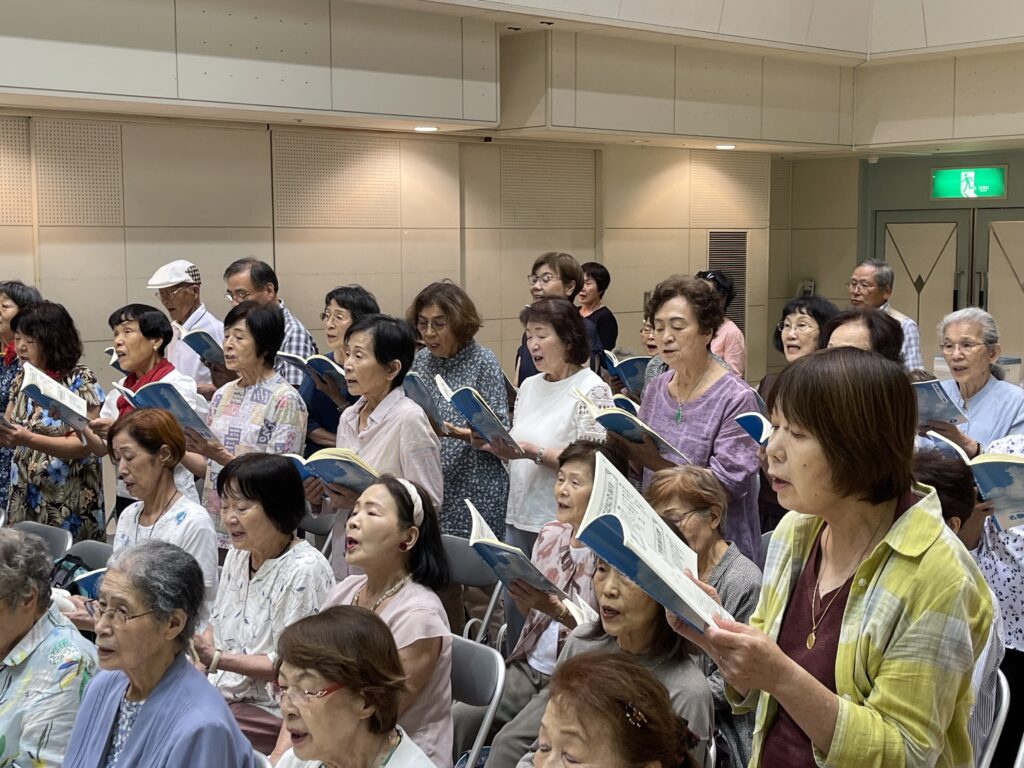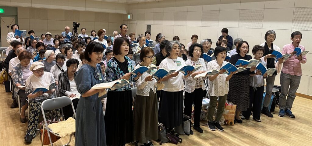 2025年8月4日(月)午後2時00分〜3時30分、京都市北文化会館の3階 創造活動室において、童謡コーラスの2025年納涼会「京都祭り」が行われました。この会場は、北大路童謡コーラスの活動拠点でもあり、月曜日の朝10時00分から月2〜3回のペースで活動しています。本日は、近隣の姉妹コーラスからも参加され大人数での合唱会が実現しました。