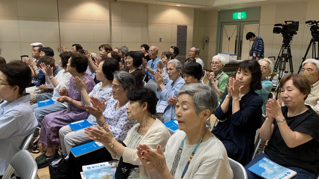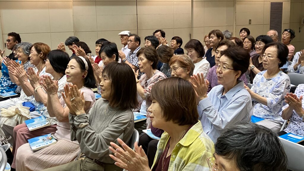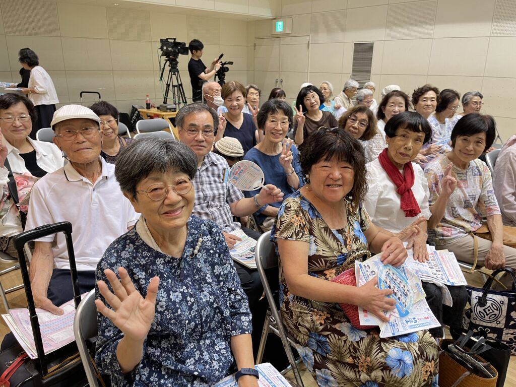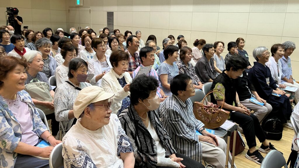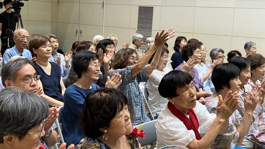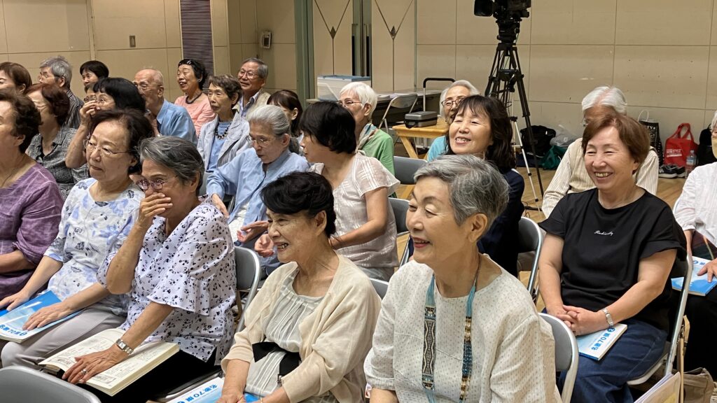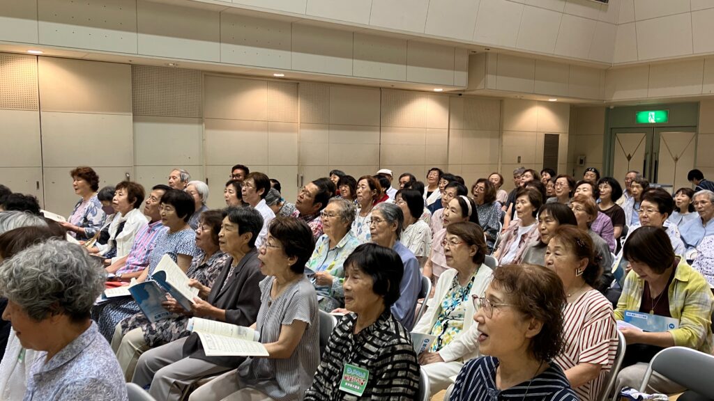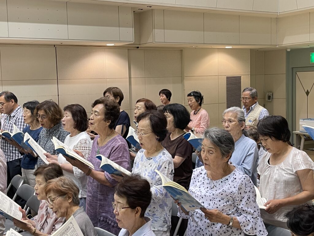 2025年8月4日(月)午後2時00分〜3時30分、京都市北文化会館の3階 創造活動室において、童謡コーラスの2025年納涼会「京都祭り」が行われました。この会場は、北大路童謡コーラスの活動拠点でもあり、月曜日の朝10時00分から月2〜3回のペースで活動しています。本日は、近隣の姉妹コーラスからも参加され大人数での合唱会が実現しました。