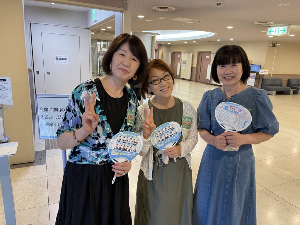 時間に合わせて続々と歌仲間が集まります。童謡コーラスのオリジナルうちわが配られました。