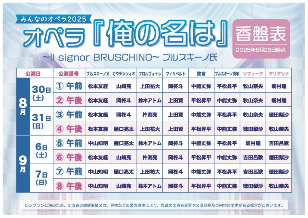 2025年8月30日(土)から9月7日(日)まで、土曜と日曜の休日を利用して全8回のオペラを開催しているのが、童謡コーラス指導員と団員有志らで構成されているオペ研ことオペラ研究座の団員らが中心となって稽古に励んできたみんなのオペラ「俺の名は(il Sinyore Burusukino)」(ロッシーニ)です。