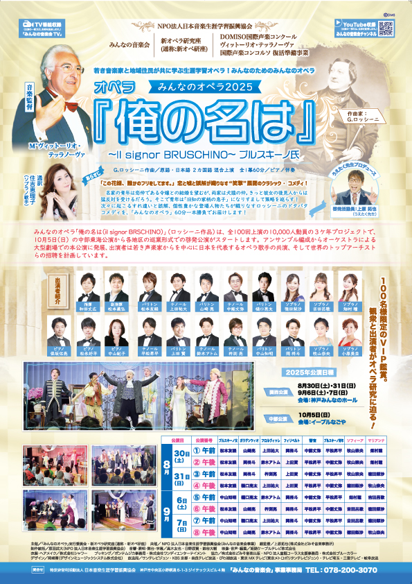 2025年8月30日(土)から9月7日(日)まで、土曜と日曜の休日を利用して全8回のオペラを開催しているのが、童謡コーラス指導員と団員有志らで構成されているオペ研ことオペラ研究座の団員らが中心となって稽古に励んできたみんなのオペラ「俺の名は(il Sinyore Burusukino)」(ロッシーニ)です。