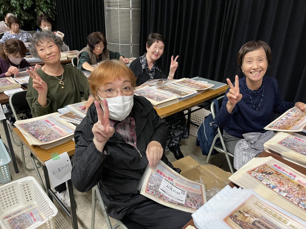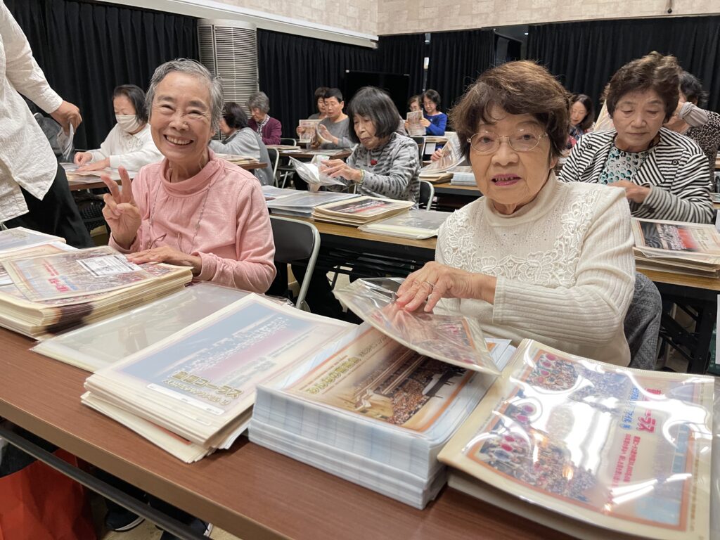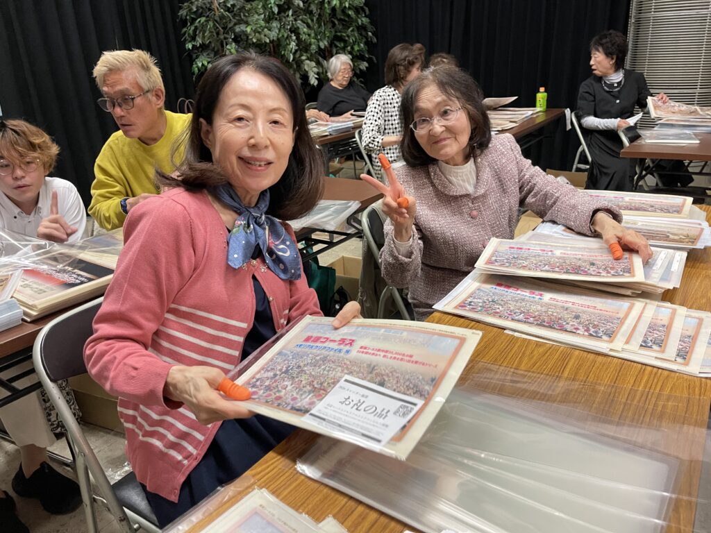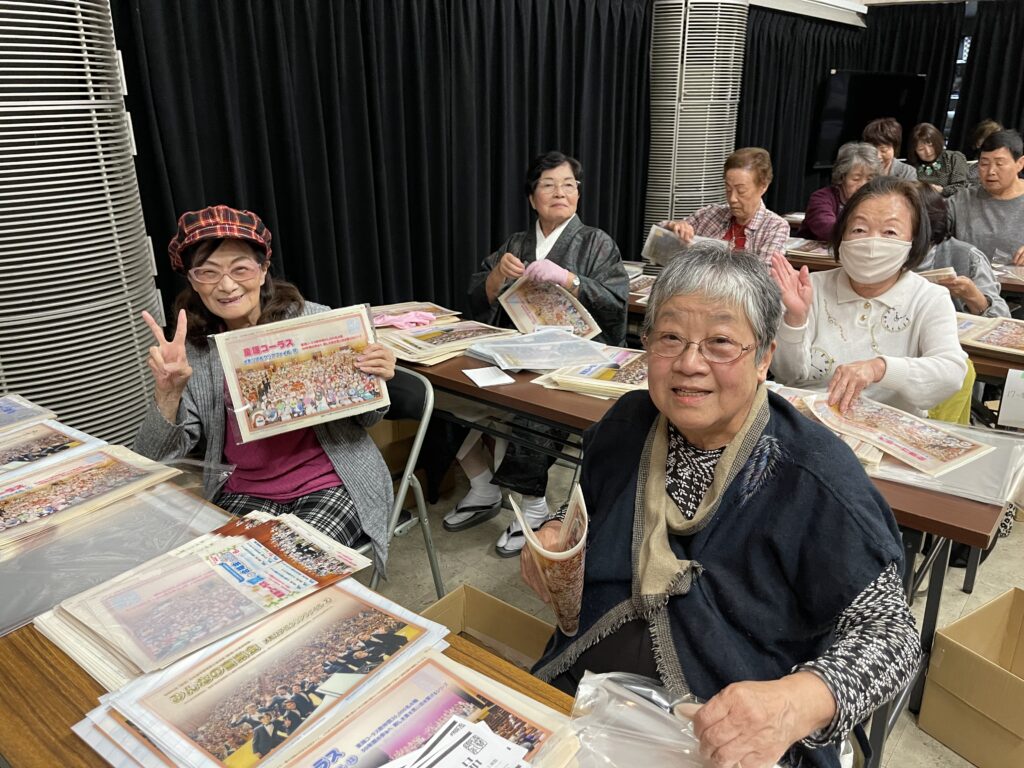 昼食休憩のお弁当会を挟んで、午後からは協賛カレンダー運動の為の「御礼の品」OPP袋詰め作業を行いました。童謡コーラスの啓発活動として、今年の合唱会や舞台発表、音楽会の活動写真がオリジナルのクリアファイルとなった「メモリアルクリアファイル」を3つの種類を1セットにして配布されます。