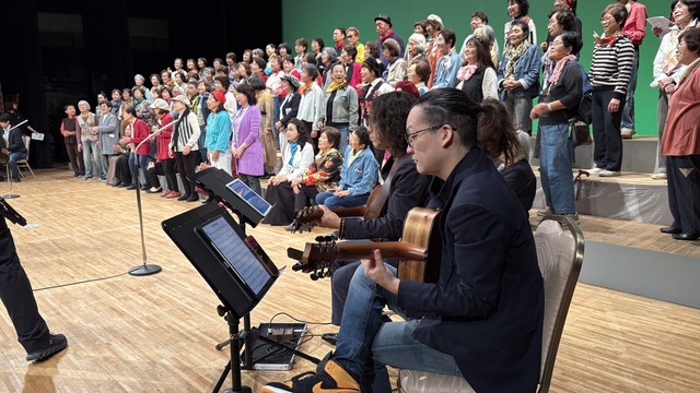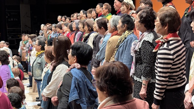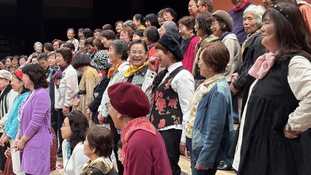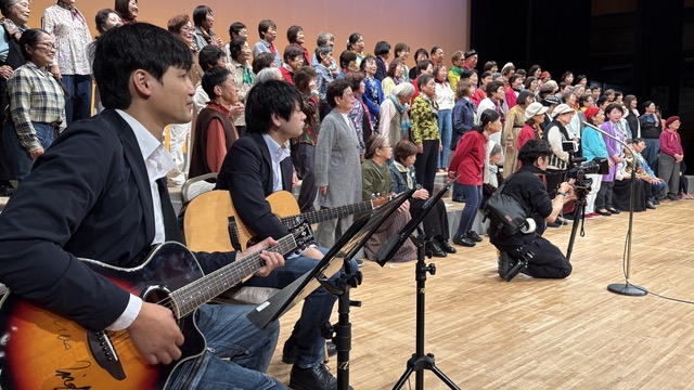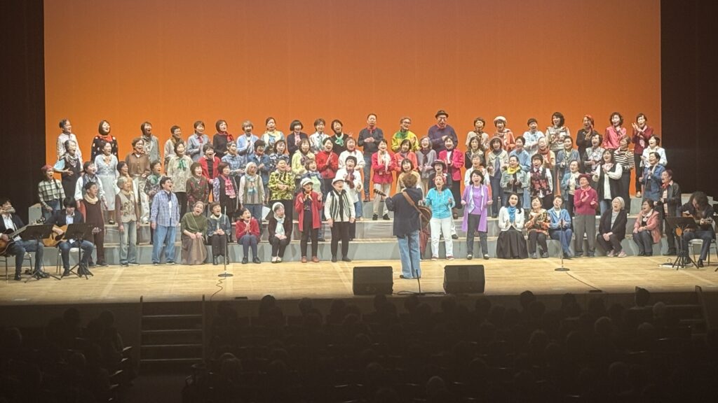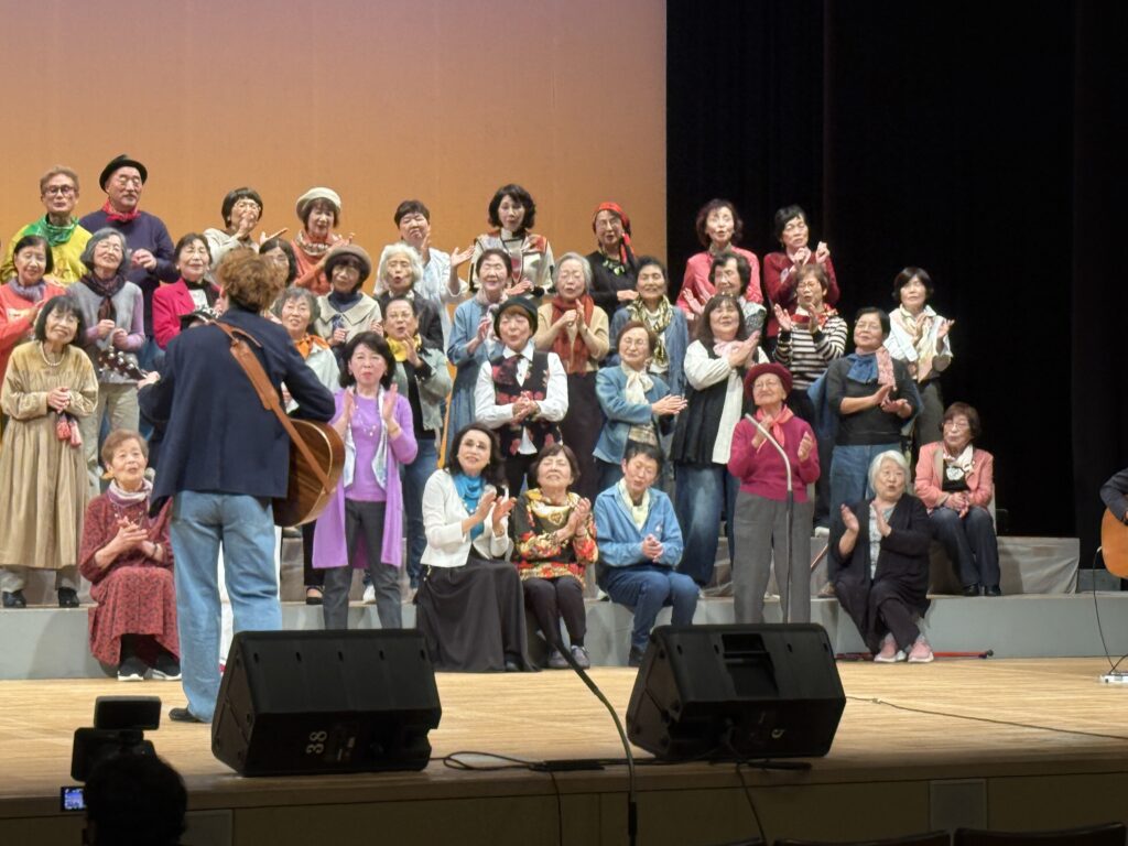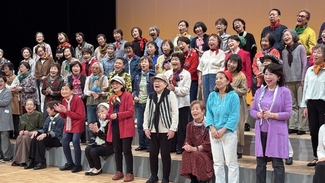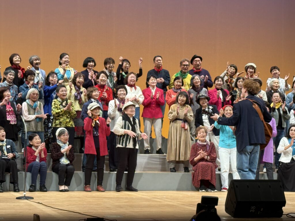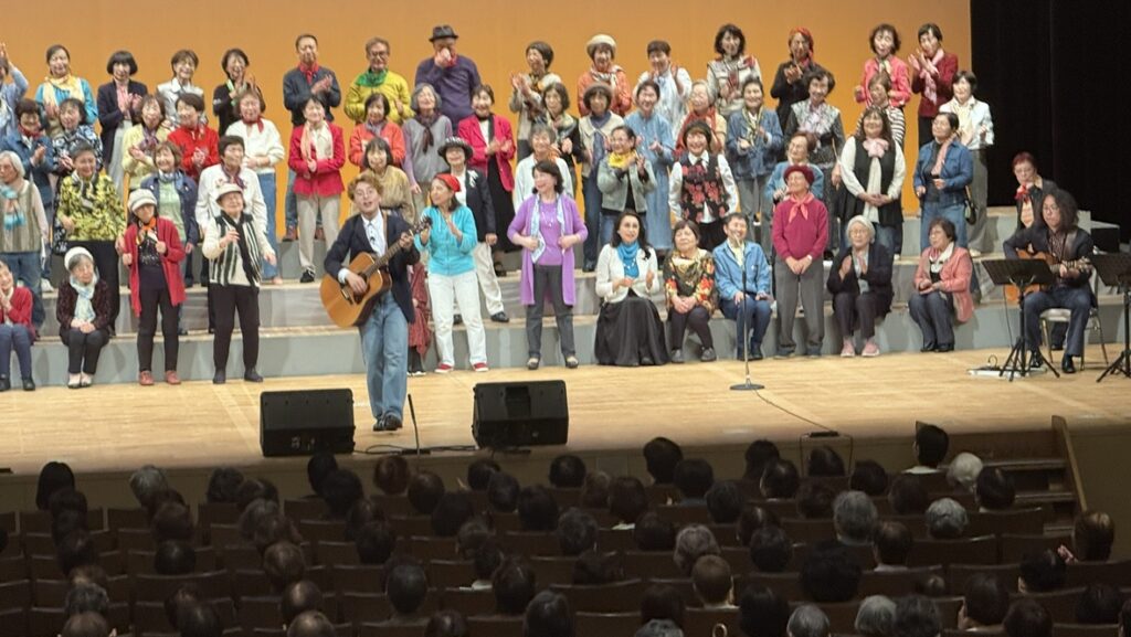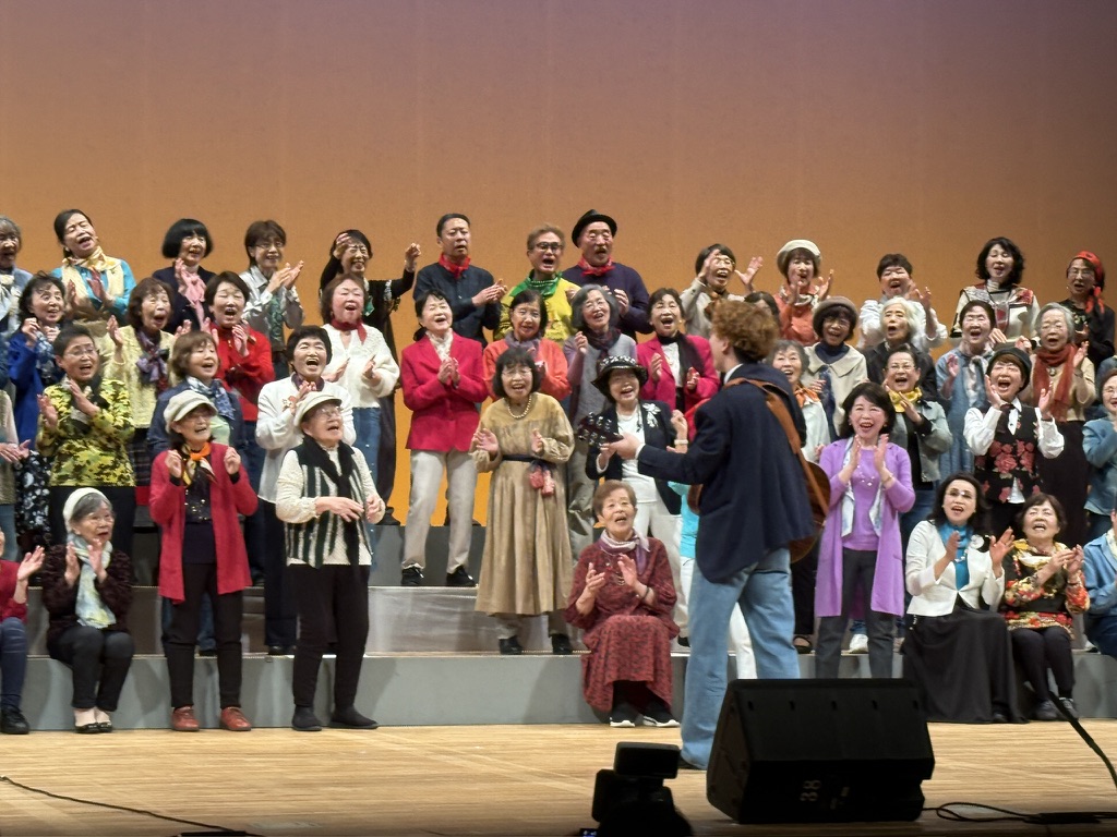 「音楽祭記念コーラス」は、上拓の会(上原拓也先生後援会)の会員やおさらい成果発表団の団員らが中心となって、各地区の童謡コーラスから歌仲間が集まり編成される音楽祭当日限りの特別合唱団です。
