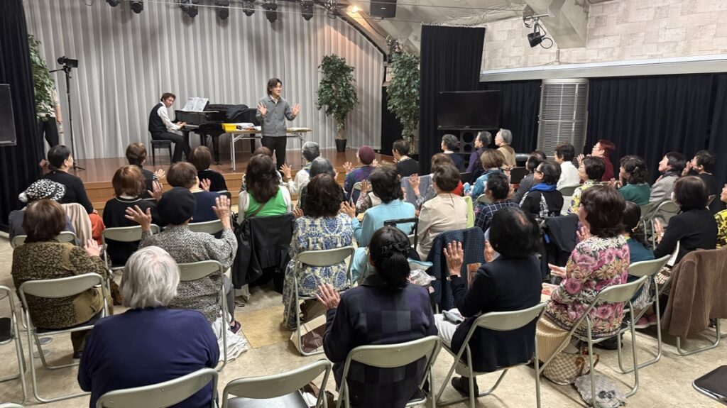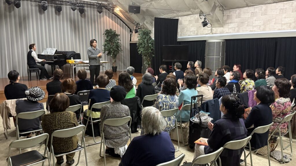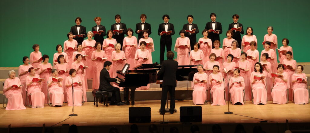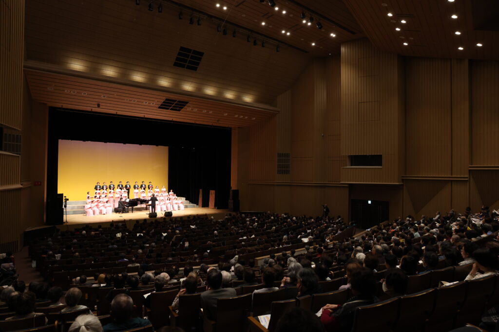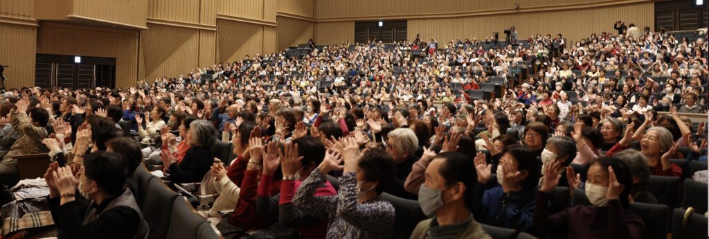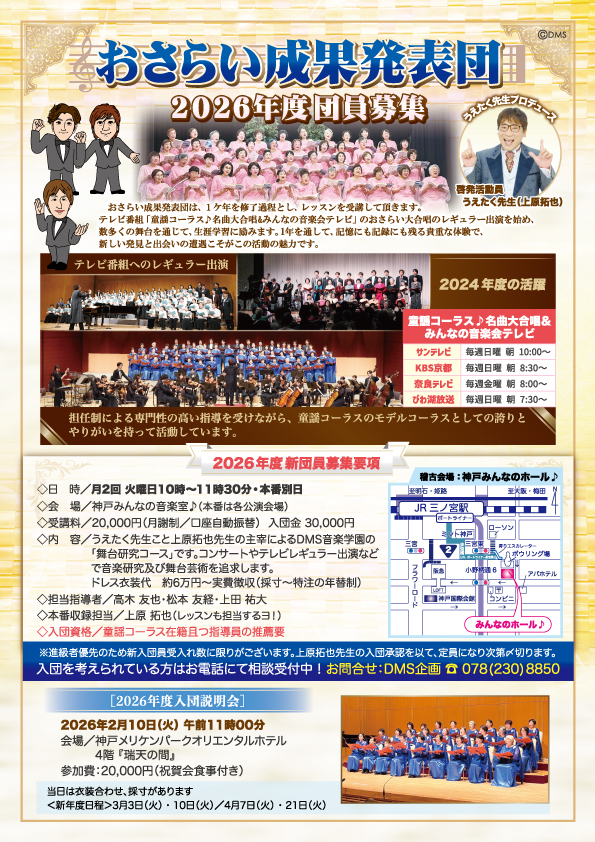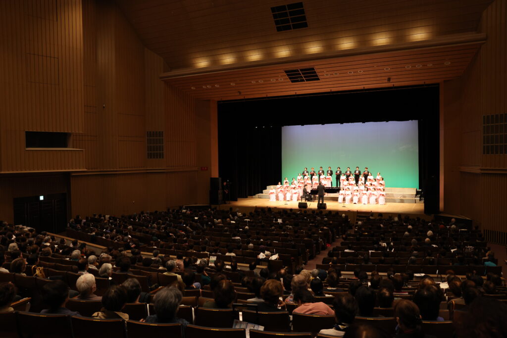 2025年10月31日(金)午後、大阪国際交流センター大ホールにおいて開催された「第34回どみその音楽祭」(主催:株式会社どみそ音楽事務所)のプログラムで、テレビ番組「童謡コーラス名曲大合唱」(各局地上波好評放送中)でお馴染みの「おさらい成果発表団関西組」が舞台出演して、名物「コマ〜シャル♪」の公開収録を見事成功におさめました。1,000名満員御礼の客席から大声援、拍手喝采!!