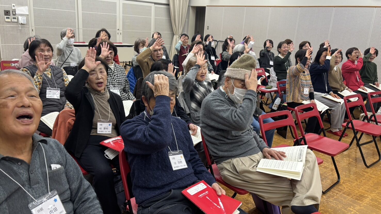 この日は12月ということで、「よろこびのうた」、「旅愁」、「ジングルベル」などを歌い、「こんにちは赤ちゃん」では振り付けもつけながら歌いました。