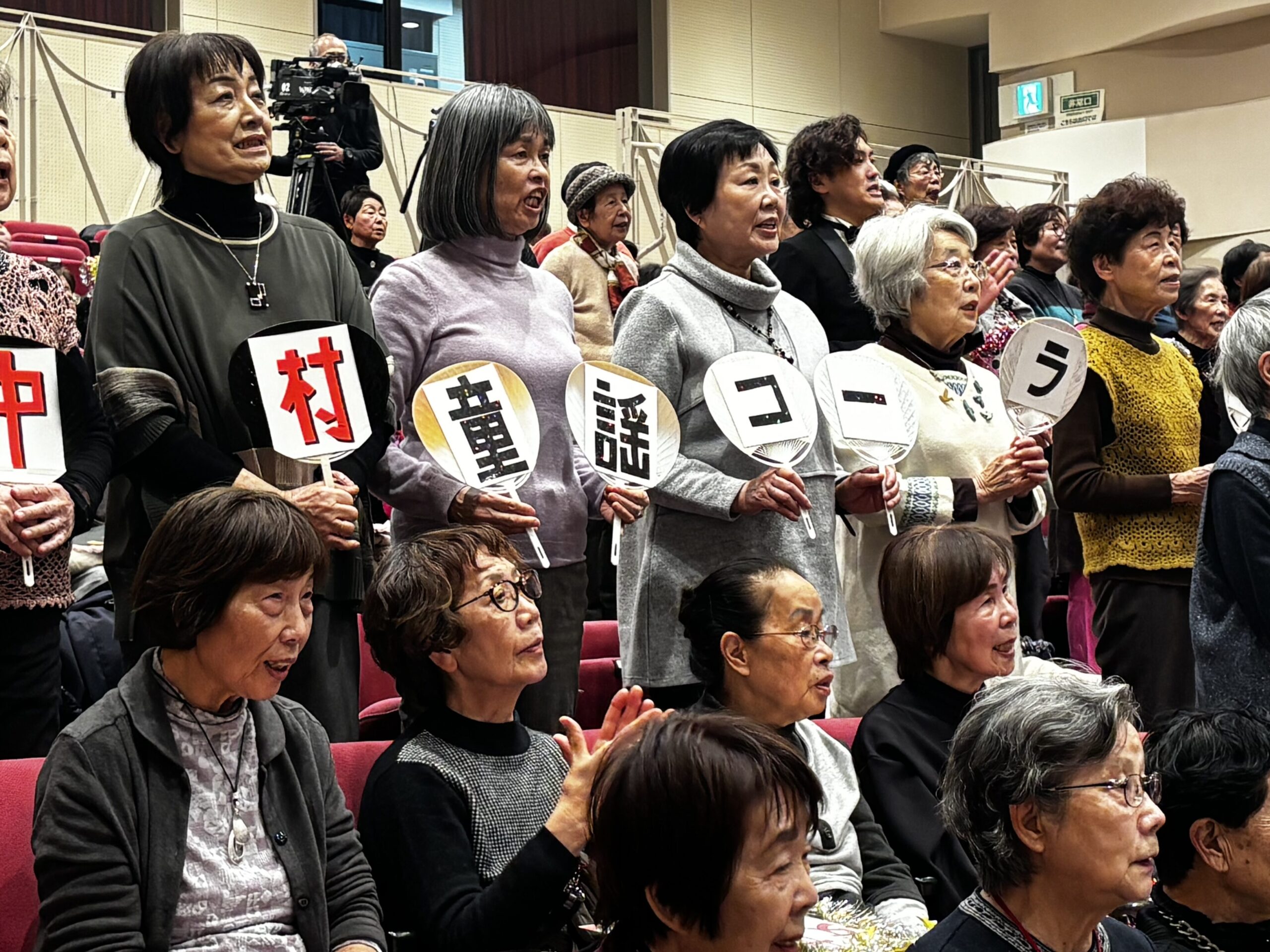 案内進行役の指導員のが団体指名で、会場客席ステージで、スタンディングコーラスを実施!団員らの手作りプラカードを掲げて、課題曲を合唱し、童謡名曲のバトンを次のコーラスへ繋いでいきました♪
