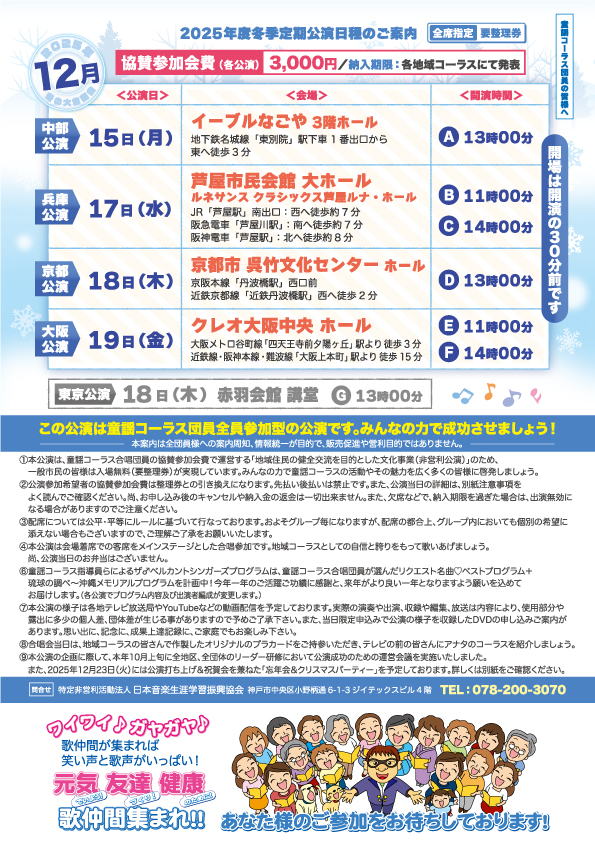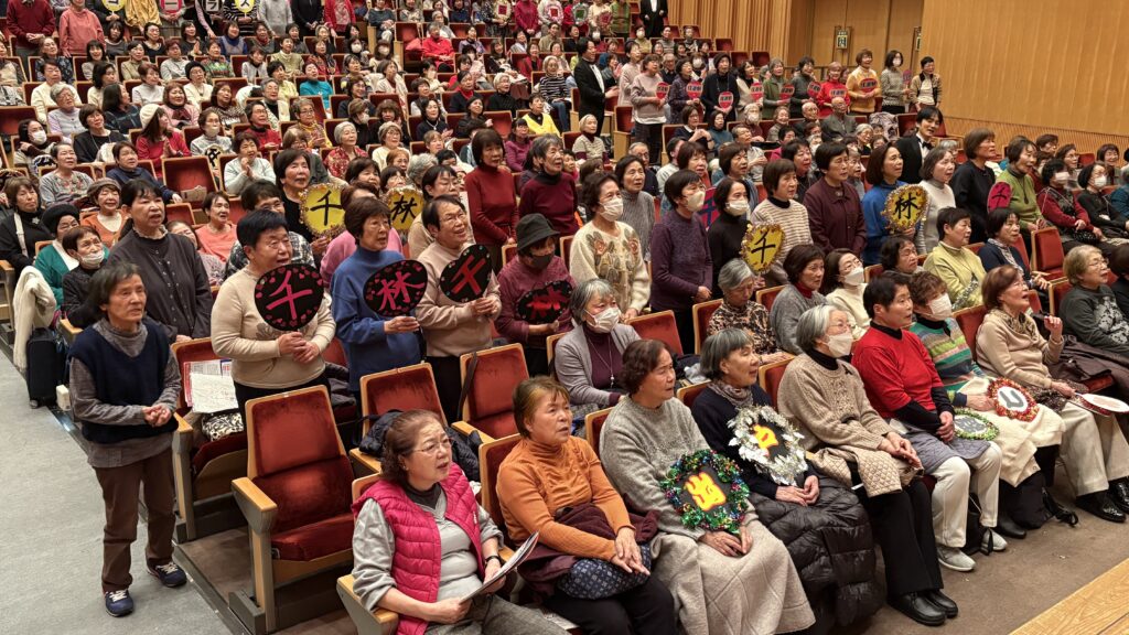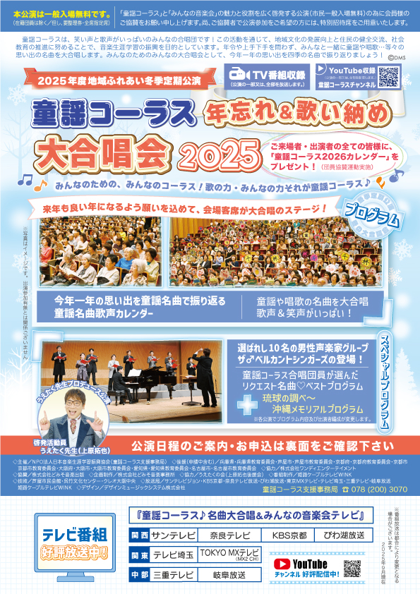 出演参加者の皆様、本日は年の瀬が押し寄せる師走の中、ご参加ご来場を賜りまして誠にありがとうございました。童謡コーラスは、コロナ禍が明けて丸4年間の活動休止から再開スタートを果たして、完全復活を果たしたアナタの街の童謡コーラス、皆様の今年1年間のご活躍、ご功績を讃え、地域の社会教育の推進に熱心なご尽力、心から敬意を表します。NPO指導員一同、来年2026年も全力でサポート致す所存でございますので今後とも変わらぬご理解ご協力を宜しくお願い申し上げます。