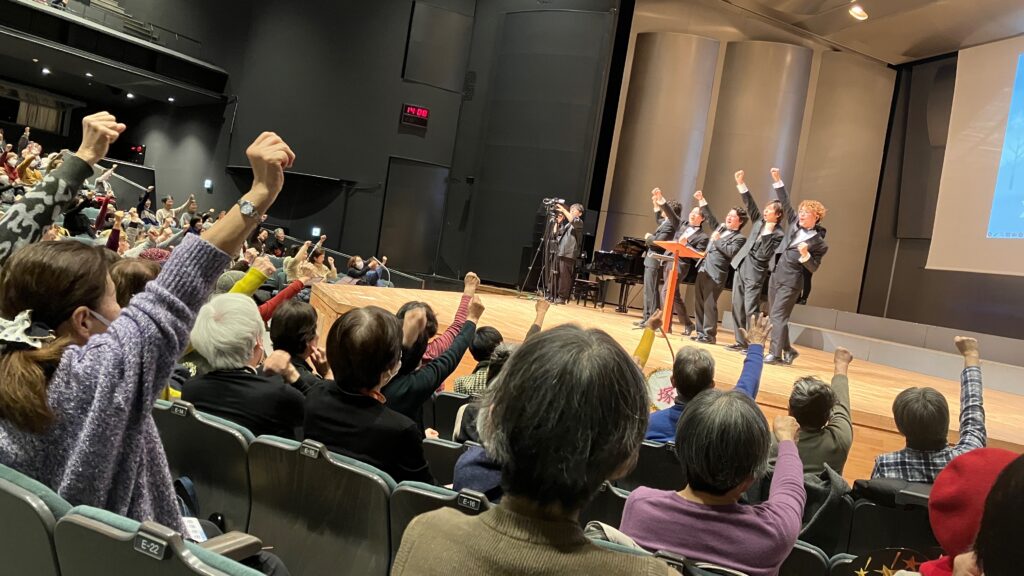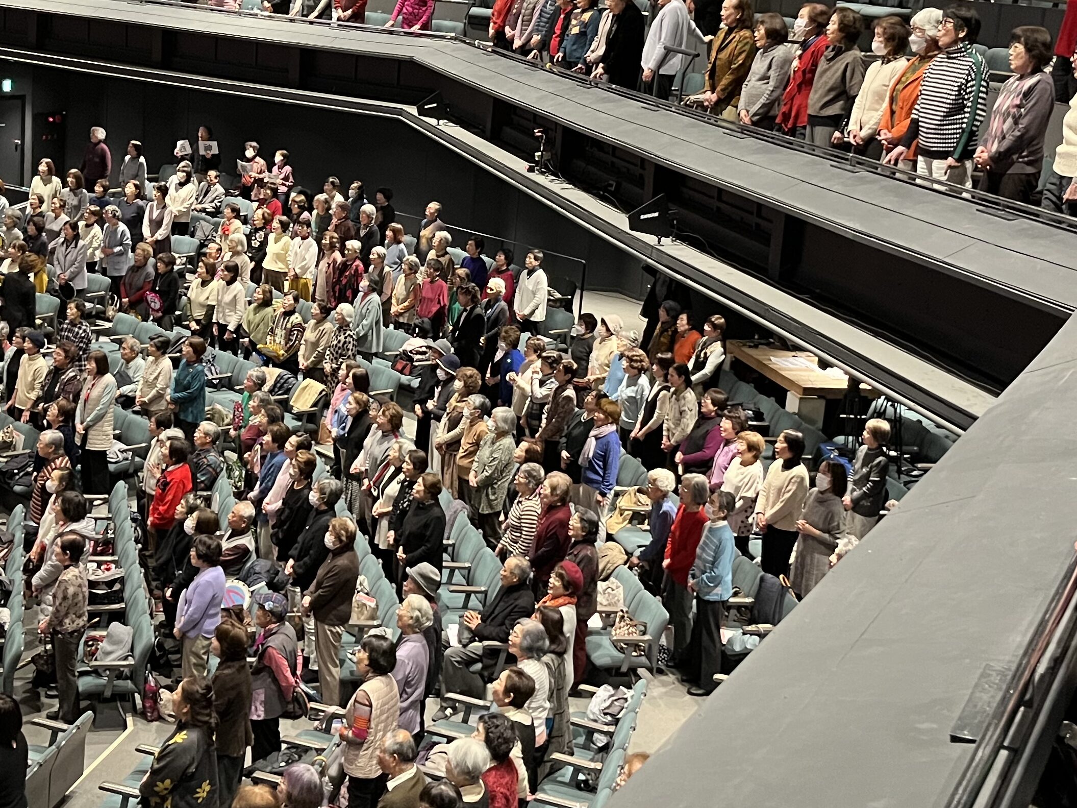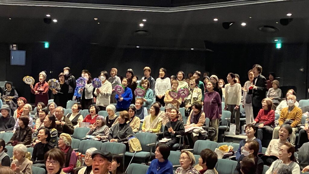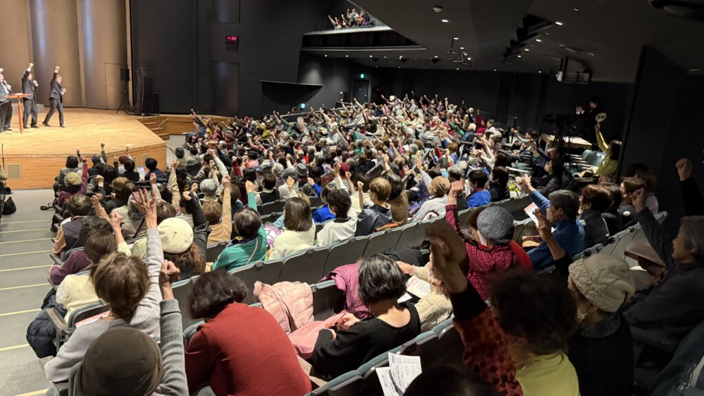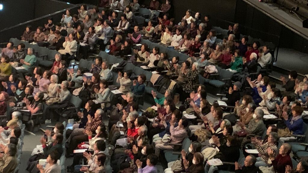 会場客席こそが大合唱のステージです。正面のプロジェクターに大きく歌詞が映写され、歌い手の団員ら皆さんが前を向き、声をそろえて歌い、手拍子や身振りを交えながら合唱に参加します。