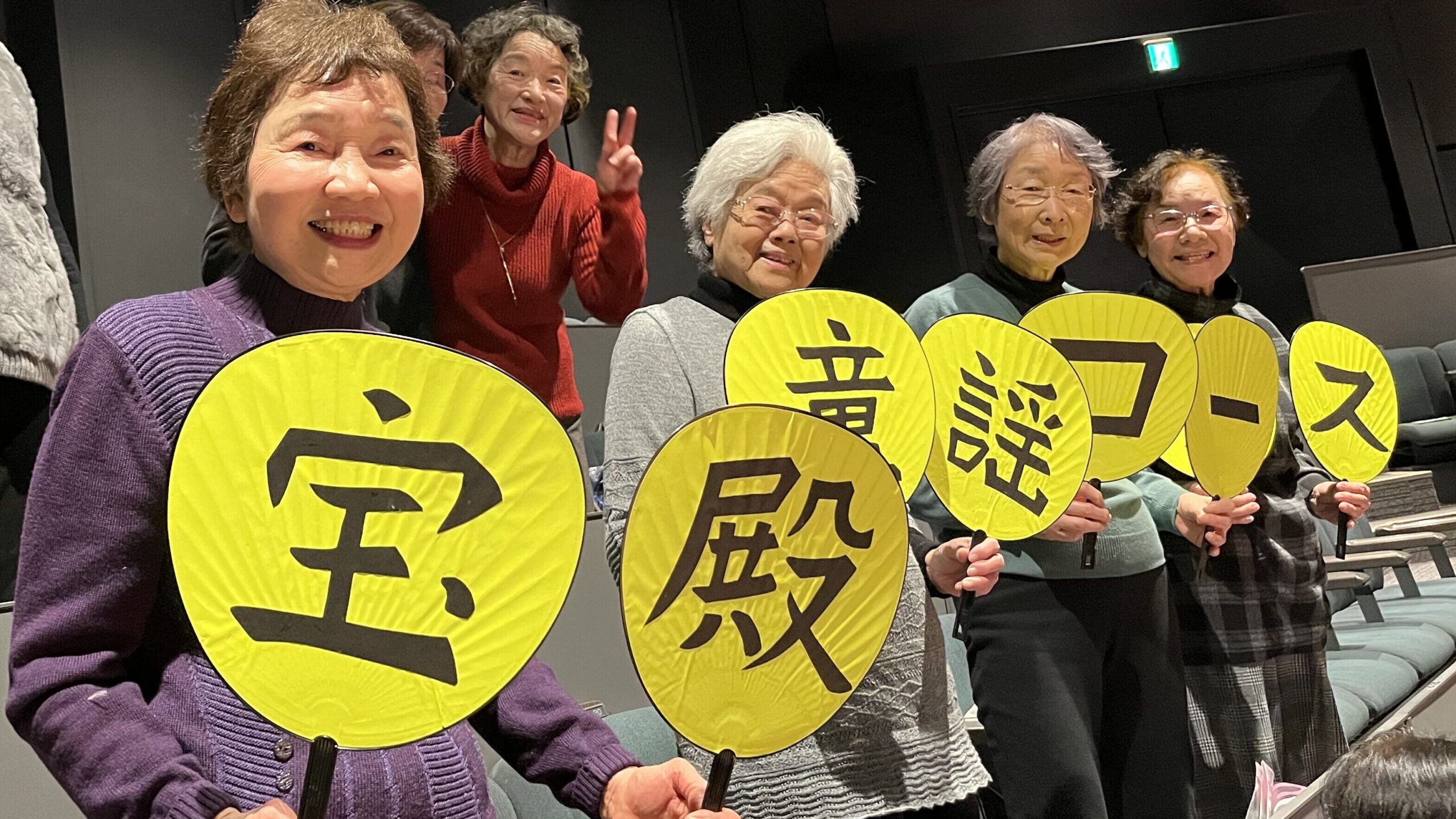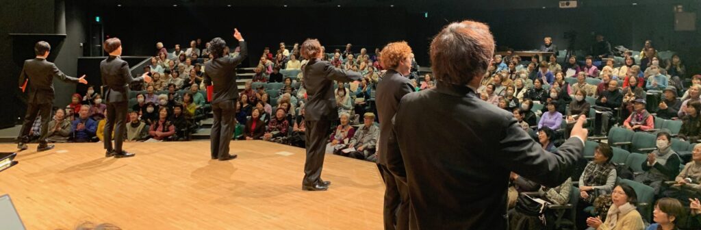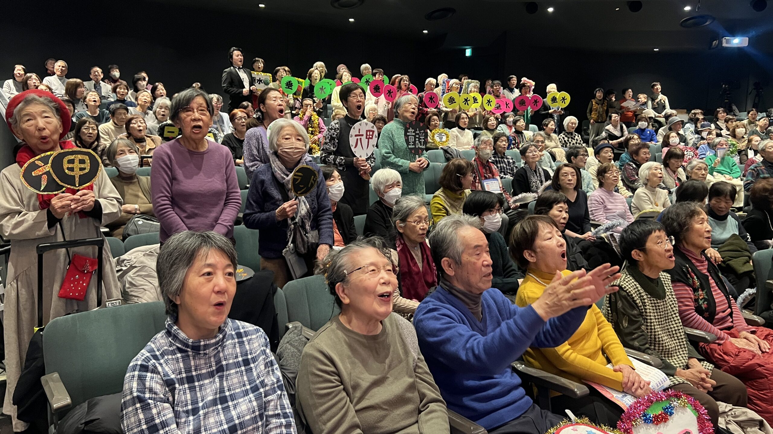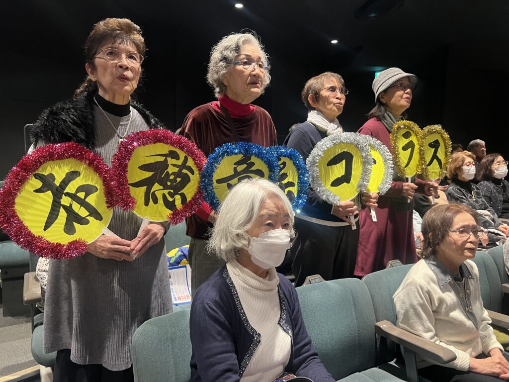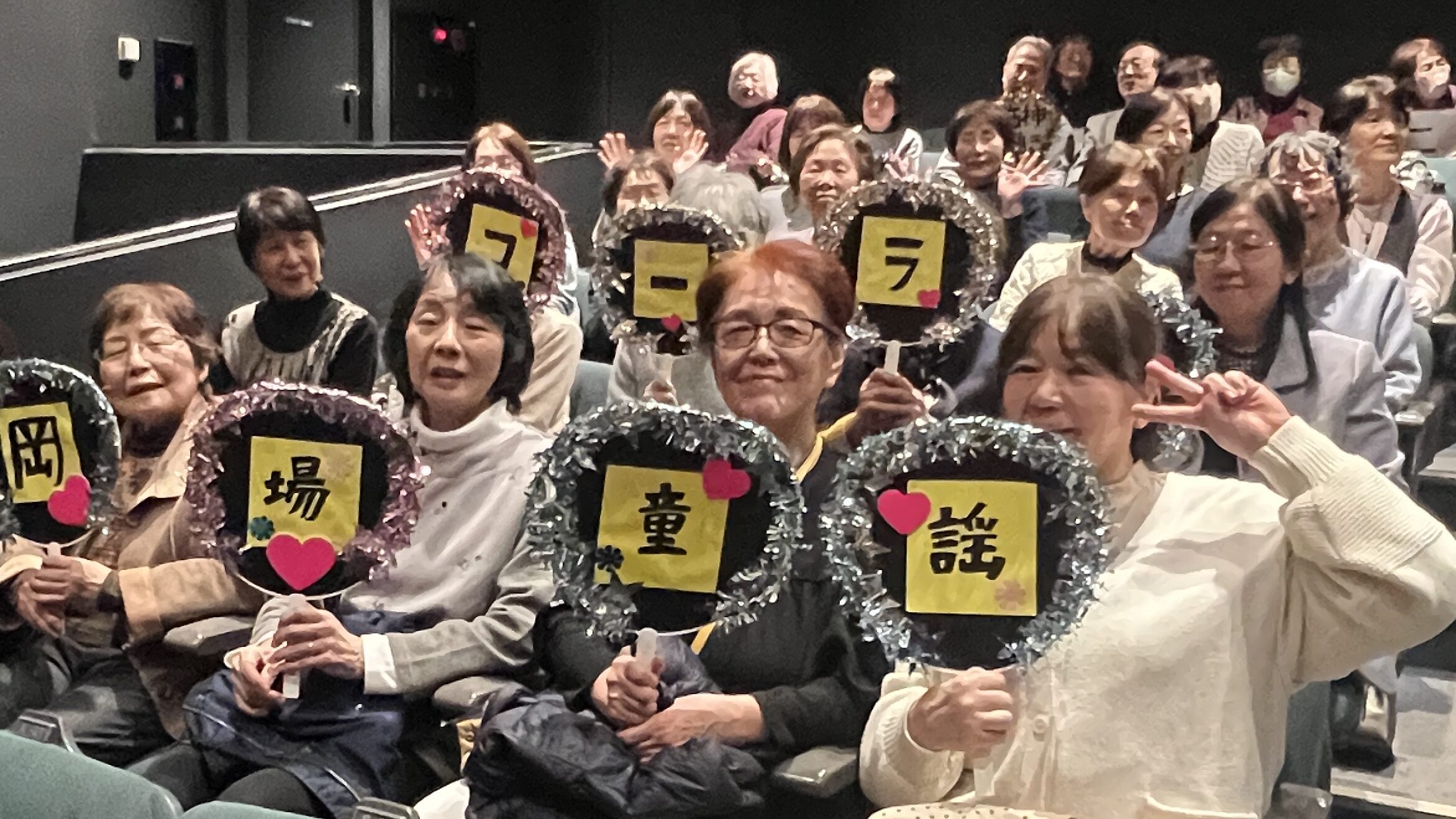 会場客席こそが大合唱のステージです。正面のプロジェクターに大きく歌詞が映写され、歌い手の団員ら皆さんが前を向き、声をそろえて歌い、手拍子や身振りを交えながら合唱に参加します。