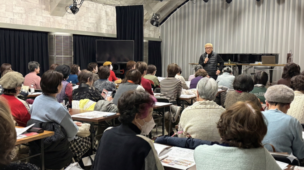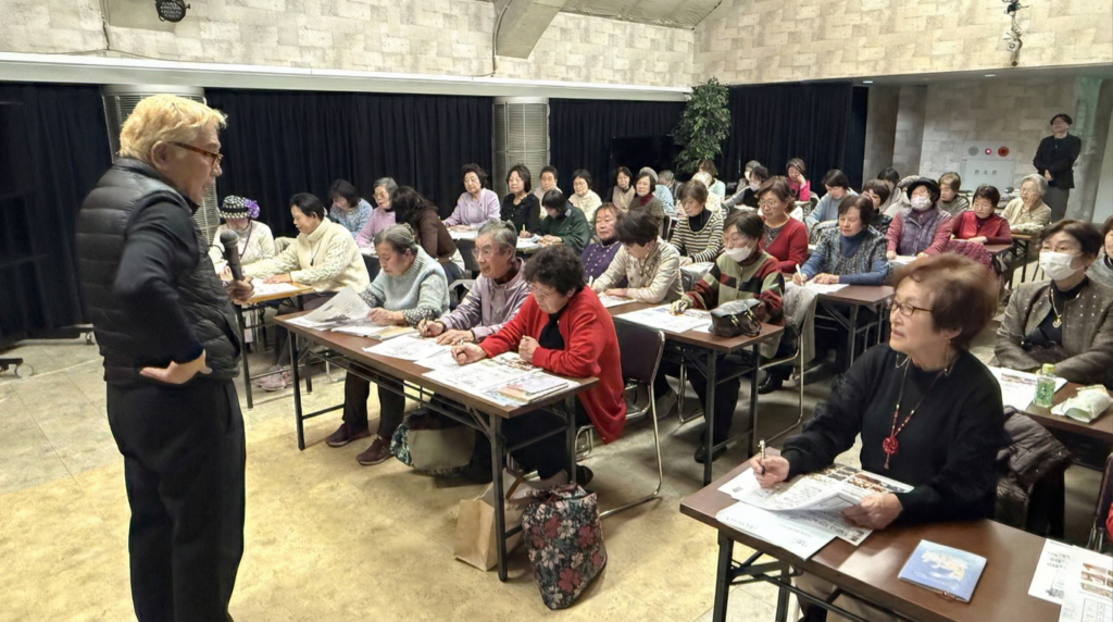 本年度の活動の集大成でもある『童謡コーラス♪春の名曲大合唱会』は、神戸国際会館こくさいホールにおいて、2,000名の大合唱会を計画しています。また、それまでに開催される、2月10日のメリケンパークオリエンタルホテルでの「早春パーティー2026」では、みんなの音楽会初開催のクラシックパーティーです。既に、満員御礼の受付終了となっておりますが、翌日11日(水)から13日(金)の2泊3日の「沖縄演奏旅行2026」の壮行プログラムも予定されています。午前中は、「おさらい成果発表団の令和七年度修了式」と新年度入団説明会が行われます。さらに2月14日(土)は、みんの音楽会「バレンタイン2026恋するコンサート」の上演…と、楽しい活動、有意義な集会、多くのNPO事業が目白押しです。実施報告と事業計画が相次ぐ中、地域活動の各団体の自主活動、自主運営の意識づくりや、活性化を図るために、うえたく先生のお話を真剣に聞いておられます。時には冗談まじりのお話で笑顔も見えます。みなさん、童謡コーラスの発展のために、ノンストップ2時間の定例会のご参加、お疲れ様でした!