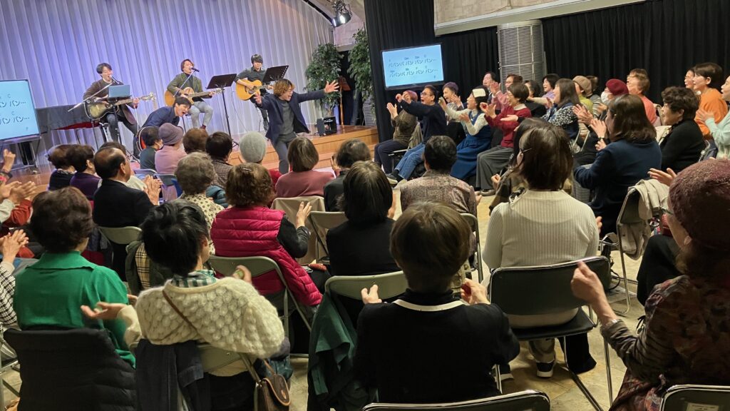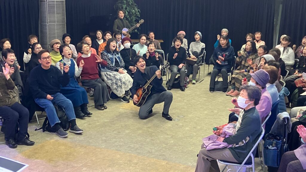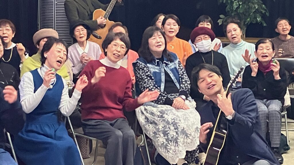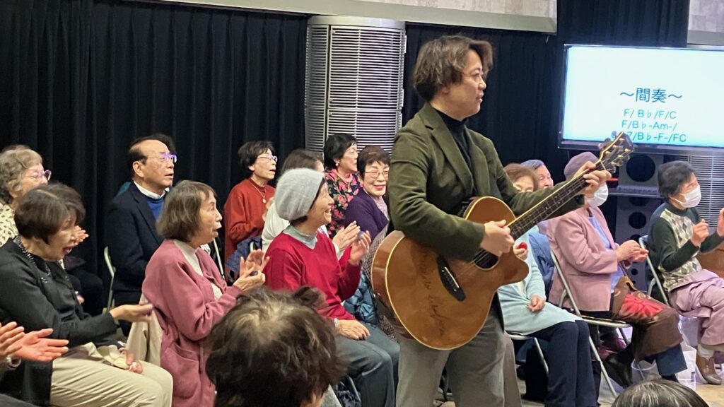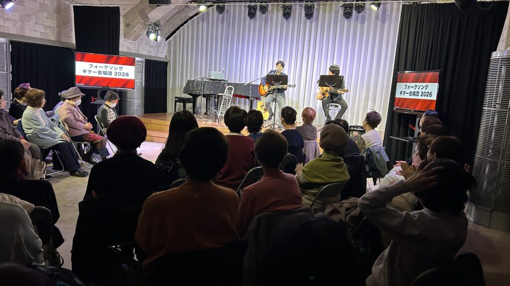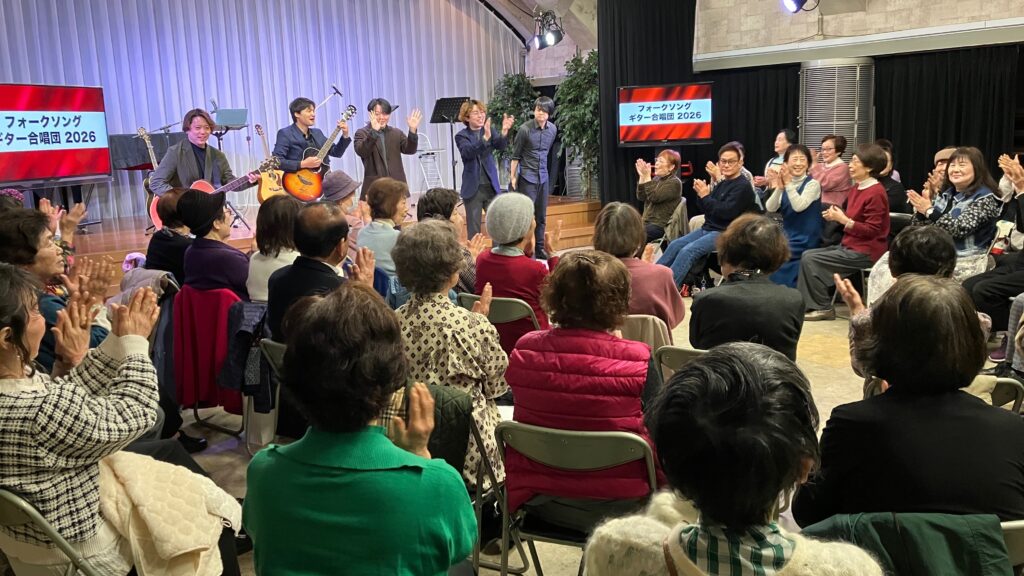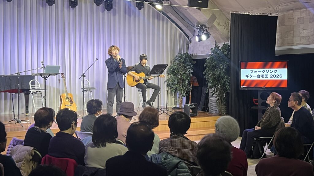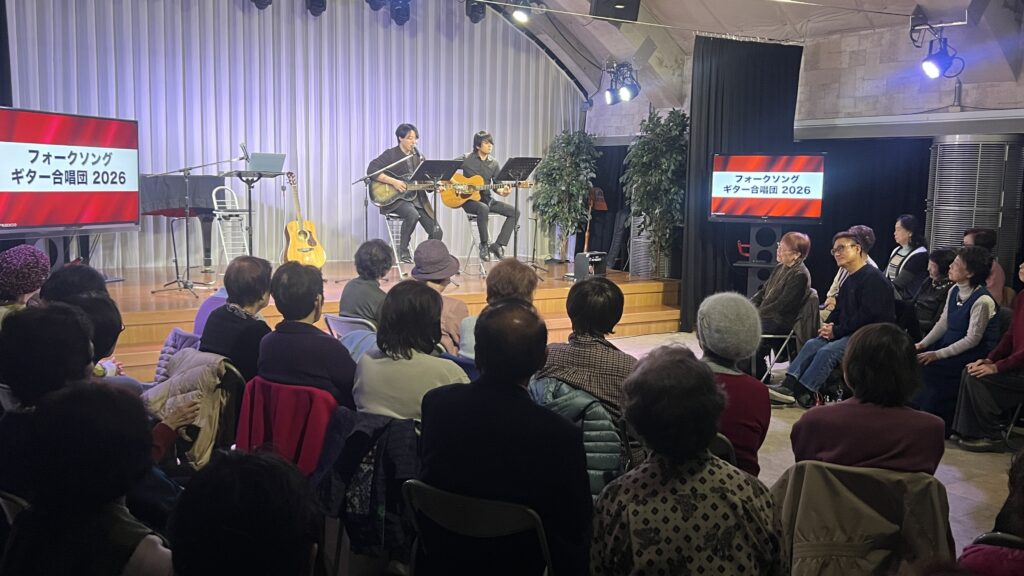 2026年3月7日(土)朝10時00分から神戸みんなホールにおいて、童謡コーラスの歌仲間によるフォークソング合唱会が行われました。鈴木アトム指導員や中能丈弥指導員らがフォークギターを弾きながら、合唱団員の皆さんと数々のヒットソングを歌いました。