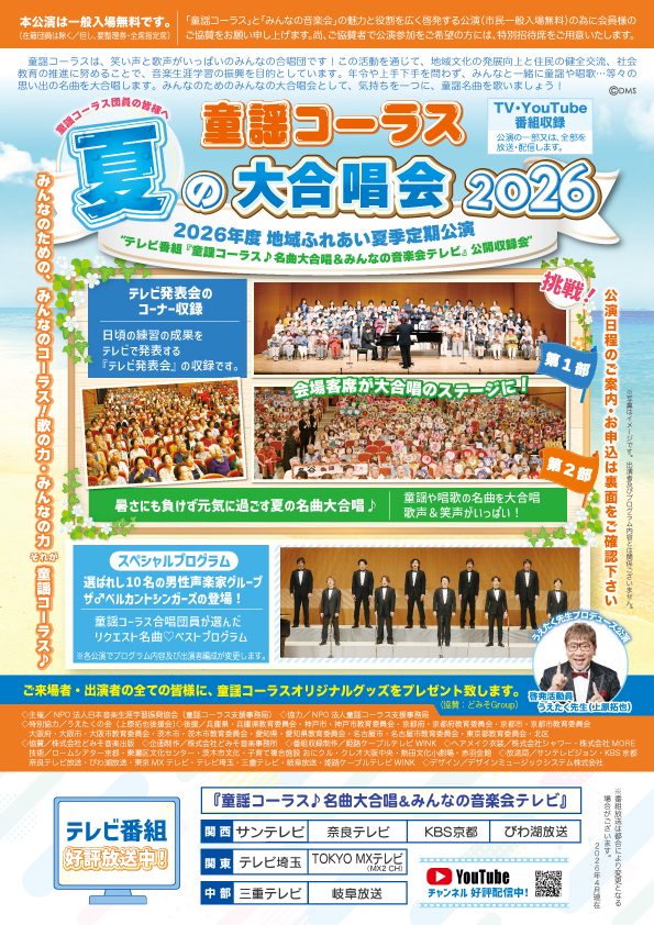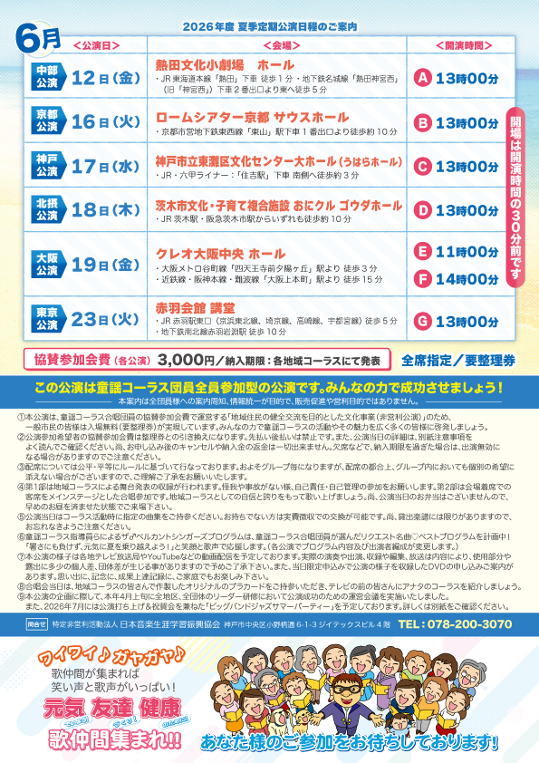 夏季定期公演 童謡コーラス「夏の合唱会2026」は、6月12日(金)名古屋熱田文化劇場を封切りに、6月23日(火)東京南赤羽会館まで、関西地区4日間5公演の全国7公演が行われます。各地区の公演運営委員会の代表様のご紹介と報告説明が行われます。